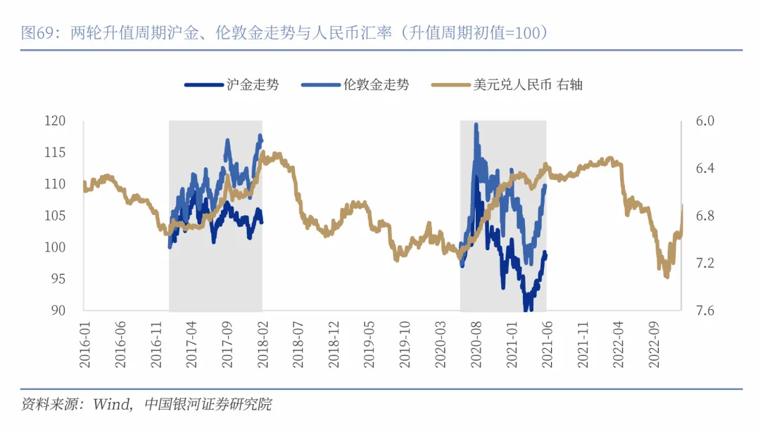 综上,两轮周期均显示出:人民币升值虽然方向上与国际金价存在一定正相关性,但由于进口成本下降、国内避险需求不足、风险偏好变化等因素,沪金涨幅往往低于理论估值,更容易表现出“涨不动”的特征。