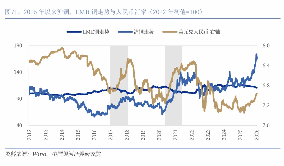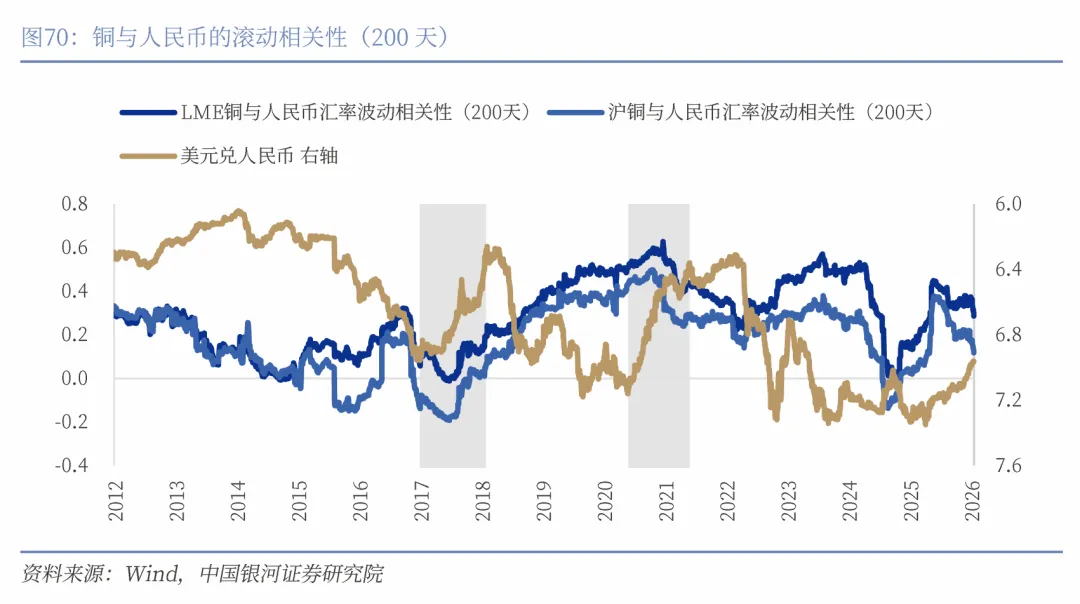 与黄金相比,人民币汇率与铜价之间的联动性在2018年之后显著增强,二者不仅在方向上表现出更强的同步性,涨跌节奏也更加贴合。尤其在人民币升值周期中,铜价往往同步上行,表现出较强的正相关性。这背后主要反映出铜的典型“工业属性”以及中国作为全球最大铜消费国,对铜价形成重要作用。在2017–2018年和2020–2021年两轮人民币升值周期中,沪铜均出现明显上涨,与LME铜形成鲜明对比。