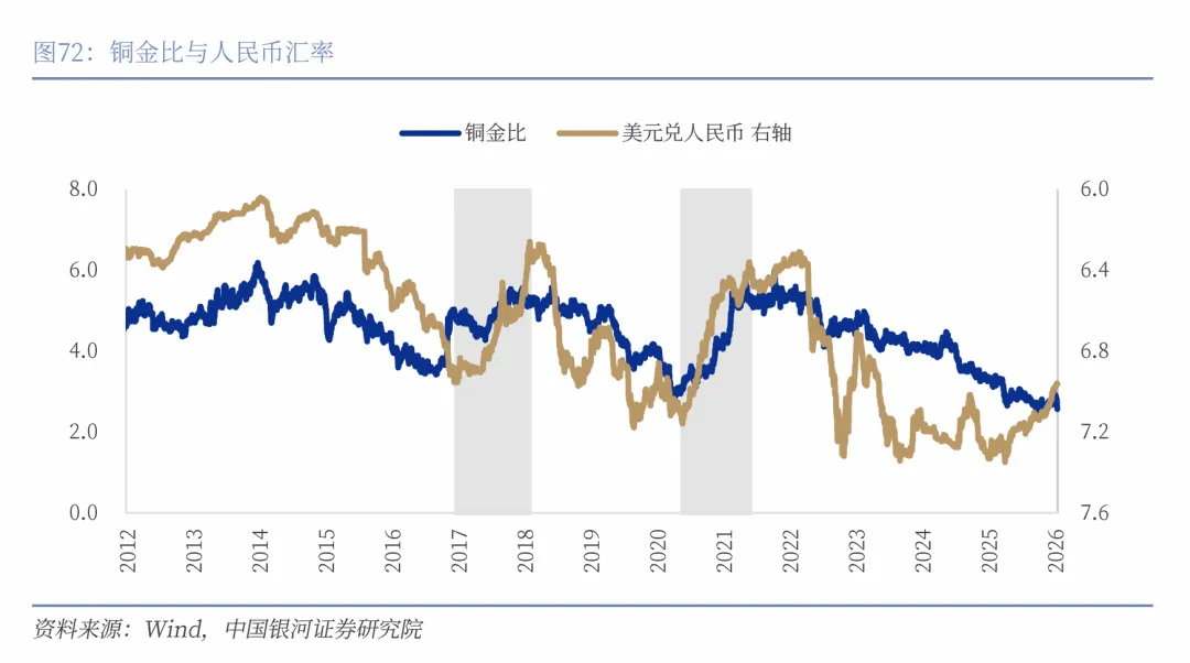 铜金比与人民币汇率的走势历来高度同步。在过去两轮人民币升值周期中,铜金比均明显上行,反映出风险偏好上升背景下铜的相对强势表现。然而自2022年以来,铜金比持续回落,显示出铜相对黄金被阶段性低估的迹象。随着人民币新一轮升值周期逐步开启,铜金比存在修复空间,铜价相对金价有望走出更强行情。