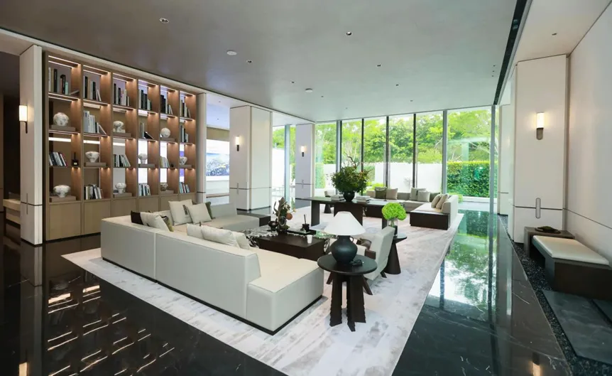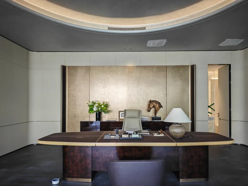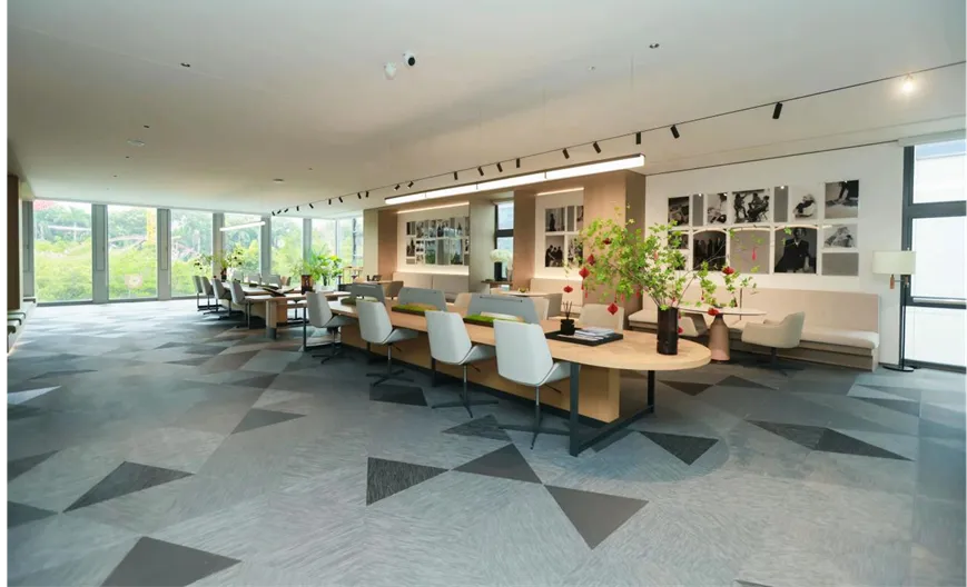 在这里,办公楼不同楼层被巧妙设计。首层被打造为集品牌展示、路演与顶级接待于一体的战略客厅。通透的落地玻璃幕墙,将前庭园林的四季景致无缝引入室内,仿佛置身于自然画卷之中。