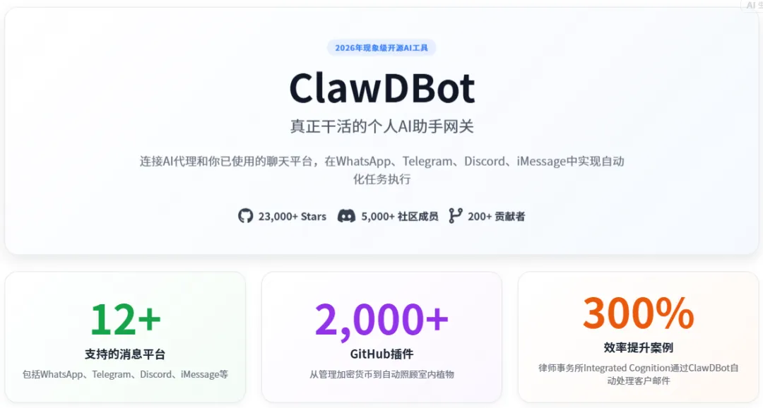 2026 年初,一款名为ClawDBot的开源 AI 工具在全球科技圈引发了现象级关注。这个起源于奥地利开发者 Peter Steinberger 厨房餐桌的项目,在短短几周内就获得了超过23,000 个 GitHub 星标,Discord 社区从零增长到超过5,000 名成员。更令人震惊的是,它甚至导致了硅谷 Mac mini 的抢购热潮,一度供不应求。