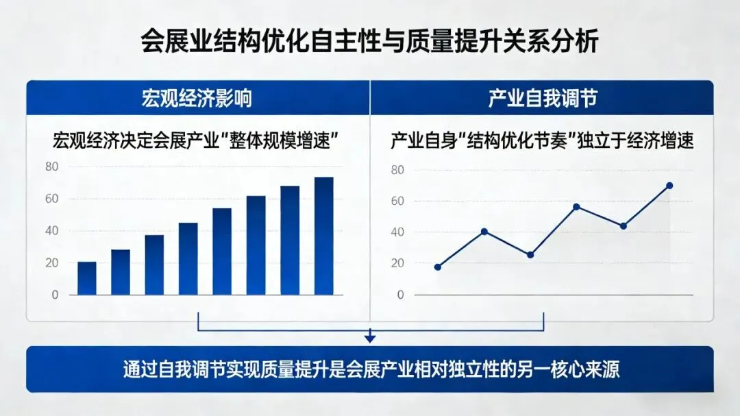 宏观经济决定的是会展产业的“整体规模增速”,但产业自身的“结构优化节奏”,却可以独立于经济增速,通过自我调节实现质量提升——这是会展产业相对独立性的另一核心来源。
