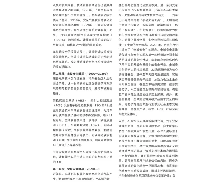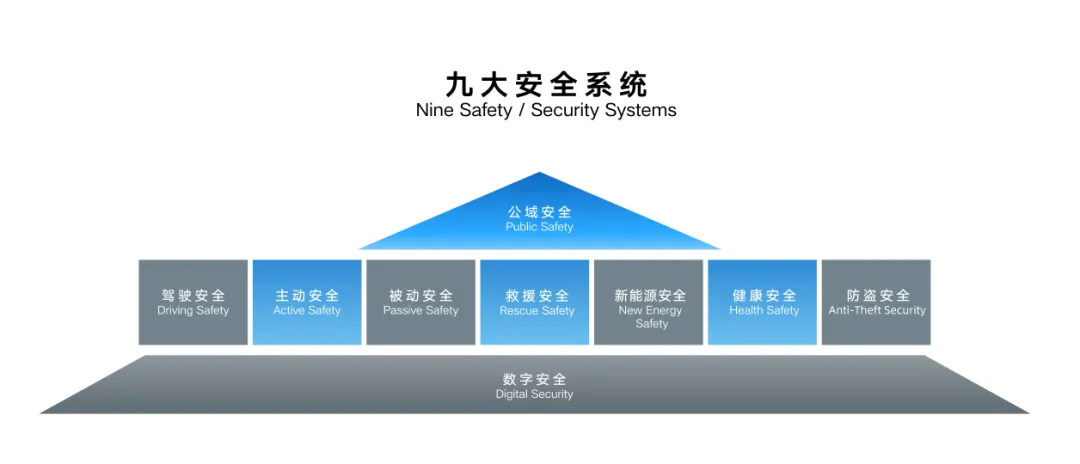 在智能时代下,用户对于汽车安全的需求不再局限于传统生命安全的单一维度。全域安全体系就是以生命安全、健康安全、隐私安全、财产安全防护为目标,贯穿“预防-防护-兜底”的全链路系统性安全。其实现依赖于驾驶安全、主动安全、被动安全、新能源安全、救援安全、健康安全、防盗安全、数字安全等多个子系统的深度协同。