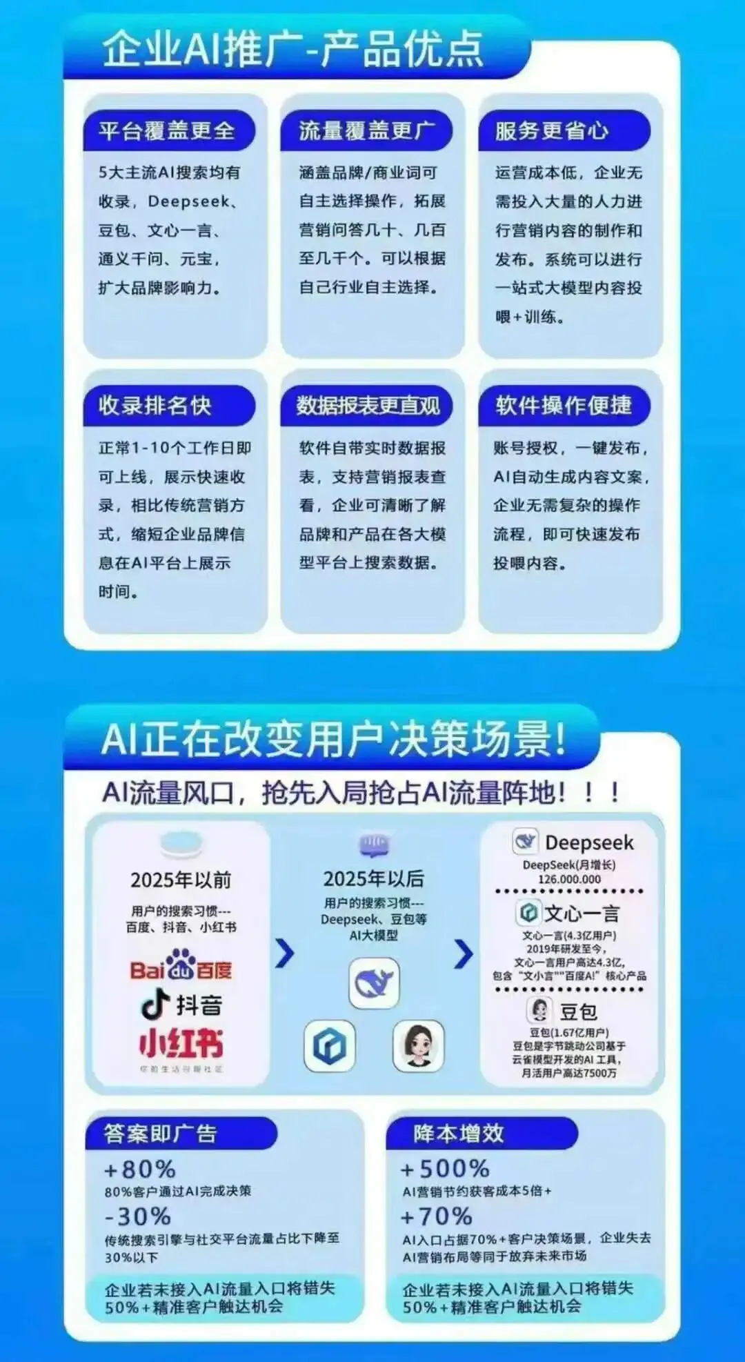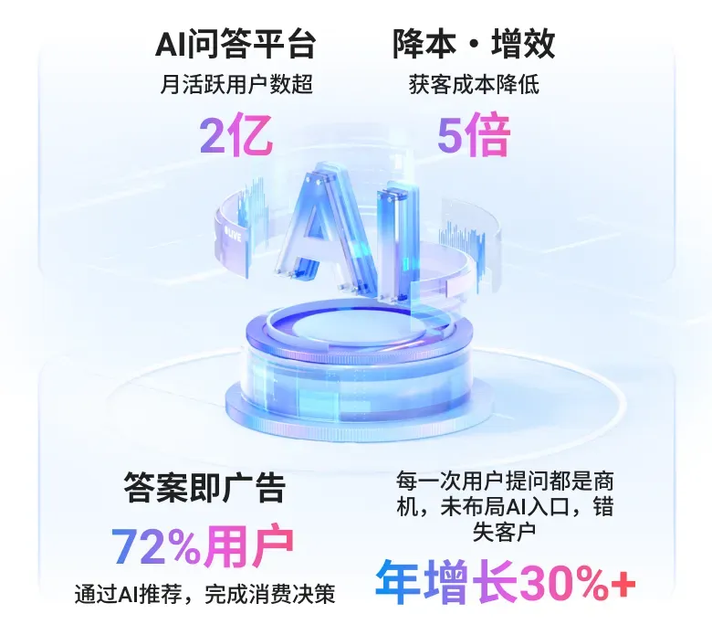 「庞大的用户基数」:AI问答平台月活跃用户数超2亿,蕴藏着巨大的潜在客户资源。 「降本增效显著」:能让获客成本降低5倍,以更经济的投入获取更多客户。 「广告价值凸显」:72%的用户通过AI推荐完成消费决策,每一次用户提问都是商机,未布局AI入口,就可能错失客户,且相关业务年增长超30%。