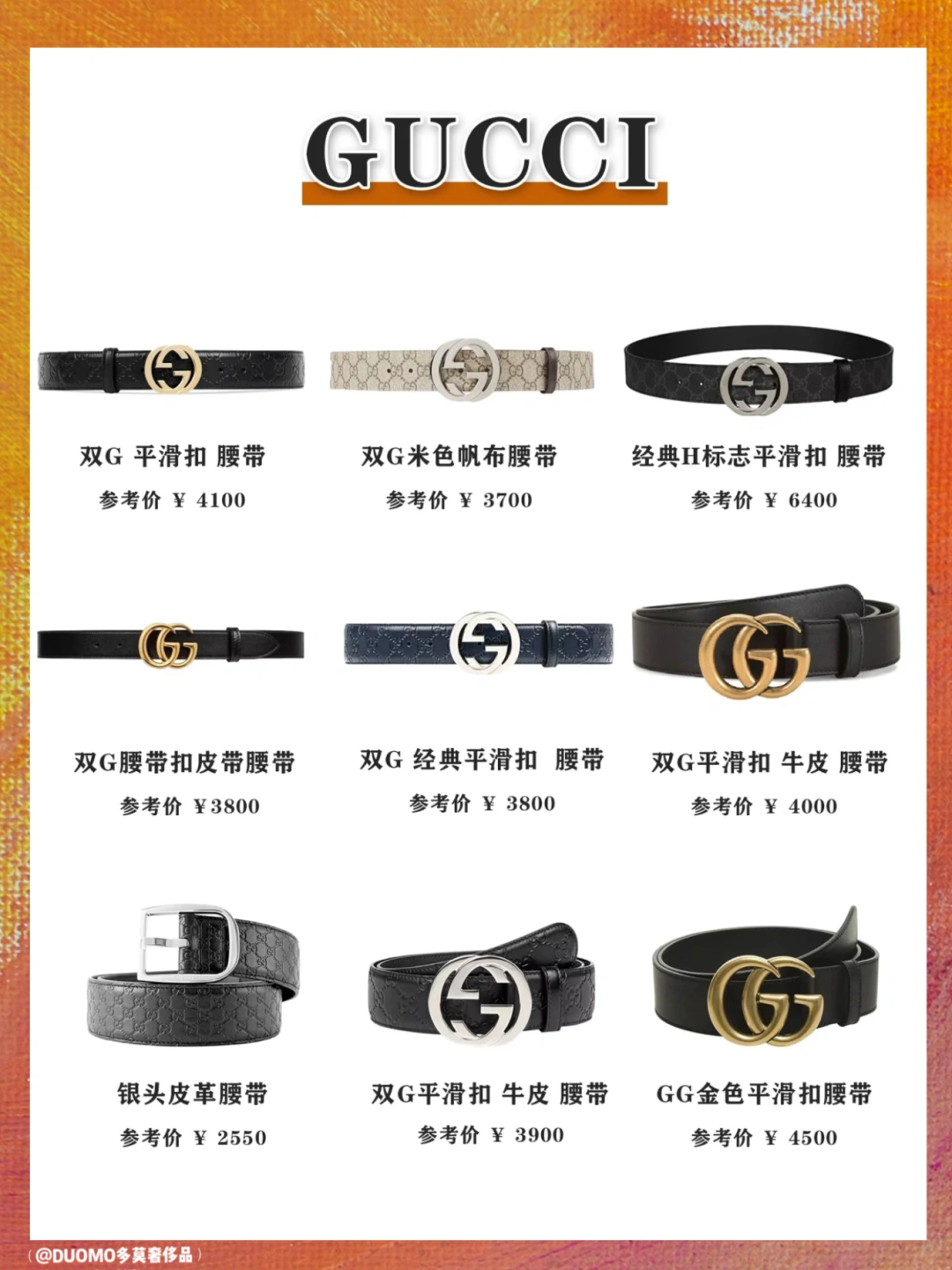 选择合适的款式:腰带有多种款式可供选择,包括经典的双G标志腰带、羊皮编织腰带等。根据你的个人喜好和服装风格,选择一个适合你的款式。考虑你通常会搭配的服装和场合,选择一个能与你的整体形象相协调的款式。