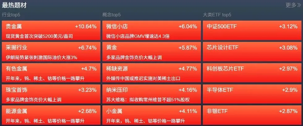 当地时间1月27日,特朗普表示“并不担心近期美元走贬”,导致美元指数一度跌超1%,刺激大宗商品价格飞涨,国际金价突破5200美元/盎司,布油突破66美元/桶,成为资源股全线爆发的主要原因。