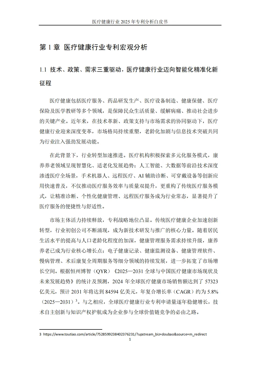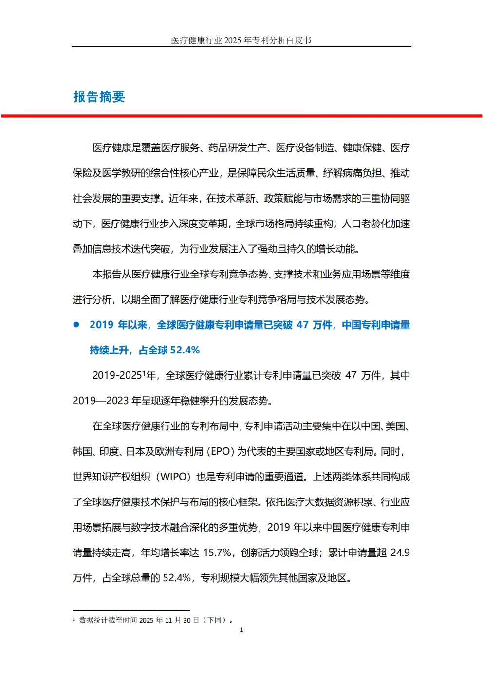 医疗健康是社会可持续发展的核心基石,在技术革新、政策赋能与市场需求驱动下,医疗健康产业正经历深刻变革。人口老龄化与信息技术突破持续注入增长动能,推动全球产业格局重构。白皮书围绕全球专利申请趋势、专利竞争格局、关键技术支撑与业务应用场景展开多维度剖析,全面呈现医疗健康行业当前的创新竞争态势。
