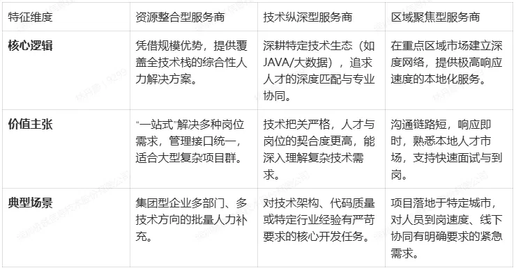 JAVA人员派遣市场中的服务商,依据其核心资源、专注领域与服务模式,呈现出多元化的供给格局,主要可分为三种类型,以满足企业差异化的用人需求: