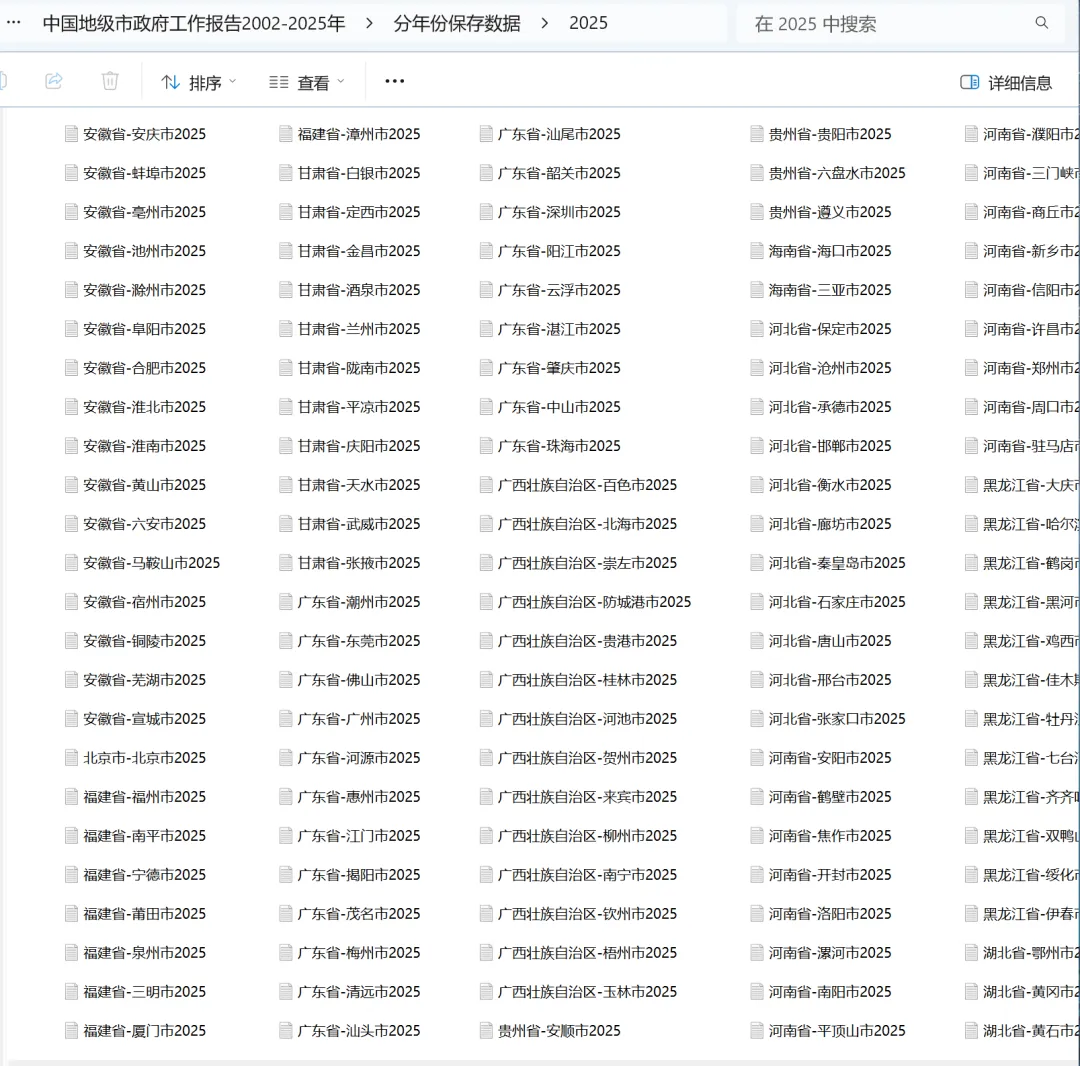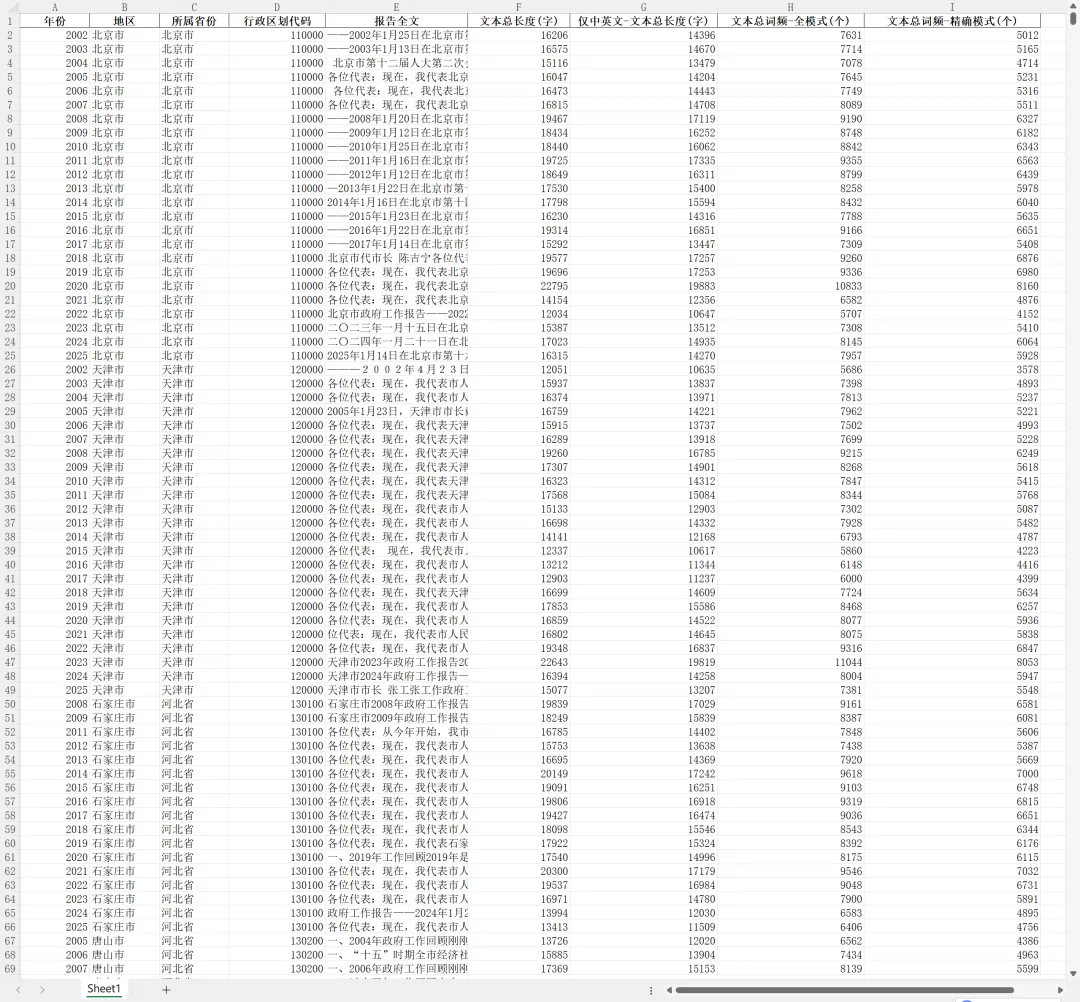 团队整理了2002-2025年间,共280多个地级市的政府工作报告文本,将原始文本保存为txt格式,同时也整理了csv格式的面板数据,便于研究人员使用