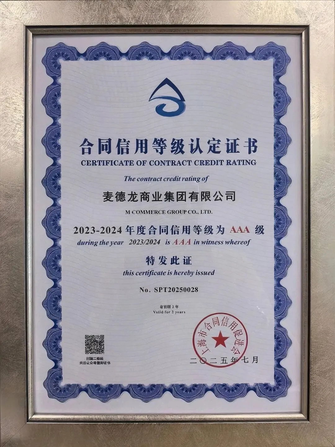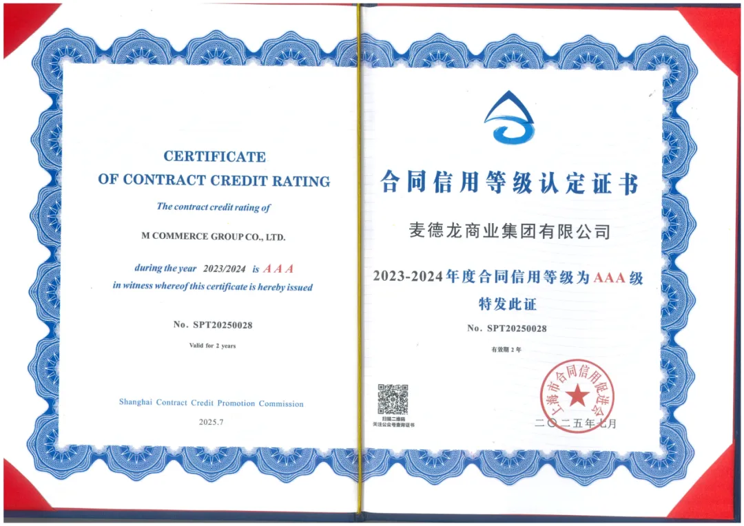 7月29日,麦德龙商业集团有限公司成功获评由上海市合同信用促进会颁布的“上海市守合同重信用企业”,并同步取得“合同信用AAA级”认定认定证书。