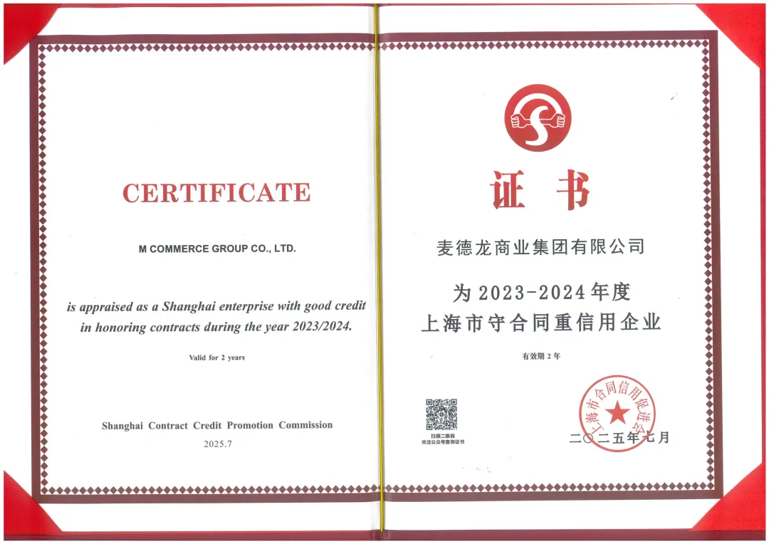 此次认证的取得,标志着麦德龙中国的诚信合规运营及合同信用表现获得了上海市主管部门的权威认可,亦是麦德龙中国长期以来在诚信营商及合规信用建设方面卓越表现的有力见证。在日常运营中,麦德龙中国始终将诚信营商原则贯穿于每一个业务环节,严格遵循契约精神及同商共赢理念,确保各方权益能得到有效保障。