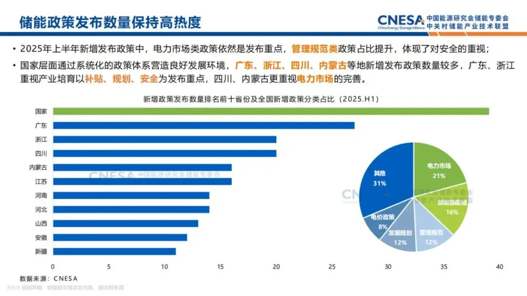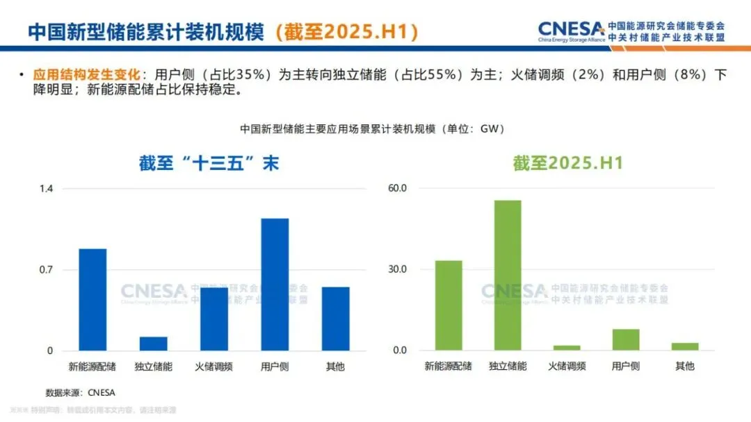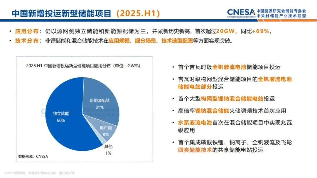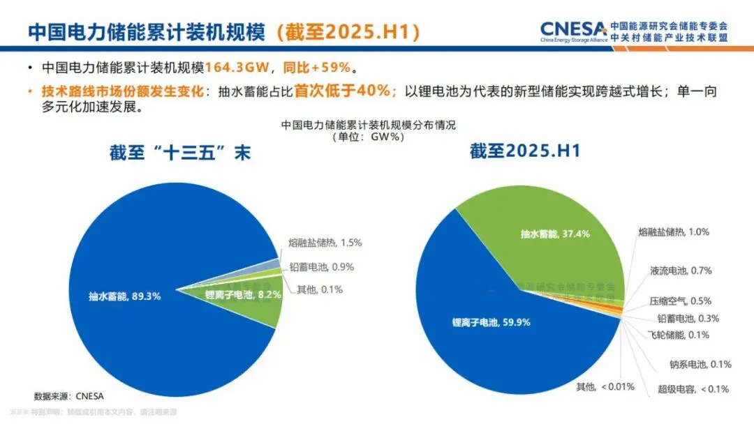 根据CNESA DataLink全球储能数据库的不完全统计,截至2025年6月底,中国电力储能累计装机规模164.3GW,同比增长59%。2025年是“十四五”的收官之年,与“十三五”末相比,储能技术路线结构发生显著变化,抽水蓄能占比首次低于40%,以锂电池为代表的新型储能实现跨越式增长,此外,单一路线向多元路线化加速发展。