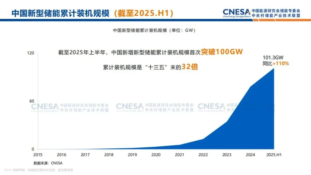 截至2025年上半年,中国新型储能累计装机规模达到101.3GW,同比增长110%,首次突破100GW,累计装机规模是“十三五”时期末的32倍。
