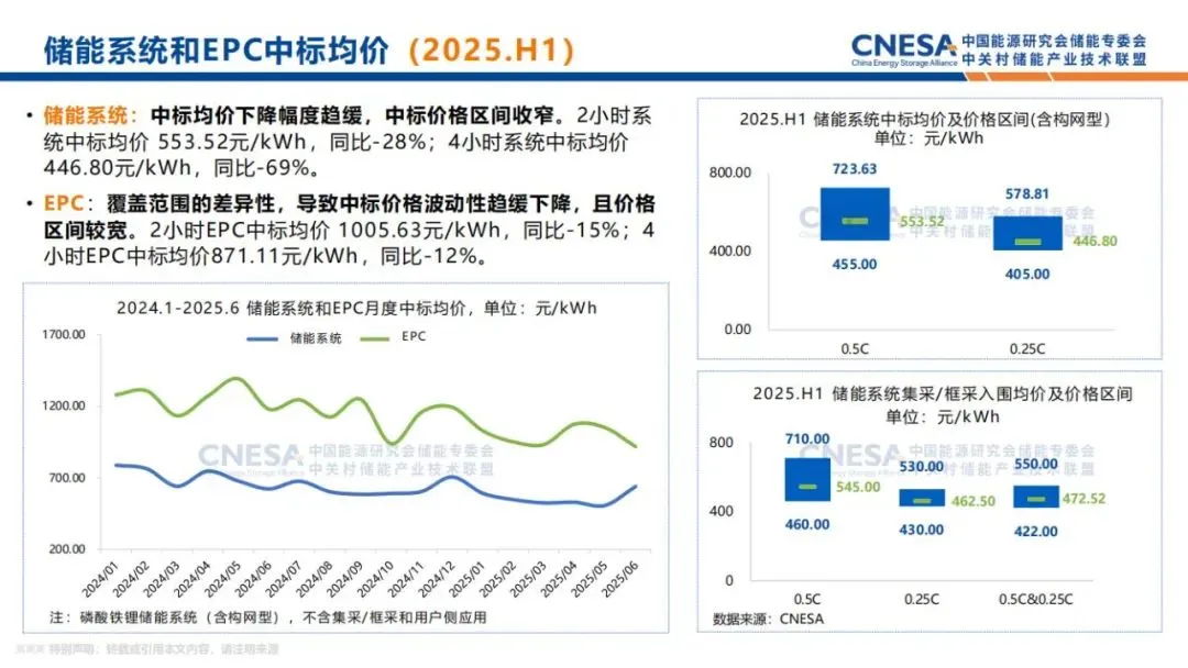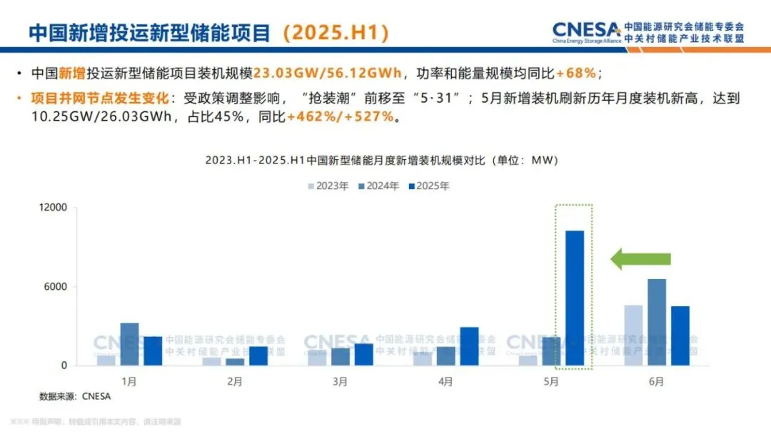 2025年上半年,新增投运新型储能项目装机规模23.03GW/56.12GWh,功率规模和能量规模均同比+68%。受政策调整影响,上半年项目并网节点发生变化,前移至“5・31”。5月新增装机刷新历年月度装机新高,达到10.25GW/26.03GWh,同比增长462%/527%。