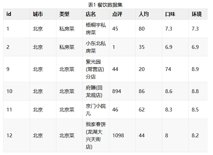 首先,对餐饮企业的数据进行了收集了整理,共记录了2891条餐饮数据,数据包括店铺id、地区、餐馆名称、餐馆类型、人均消费、评价数量、环境评分、口味评分和服务评分9个变量。