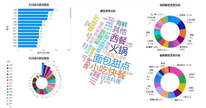 比如我们可以先看看哪个城市的餐馆数量最多?哪个类型的餐馆数量最多?以及不同类型的餐馆在各个城市中的分布情况如何?