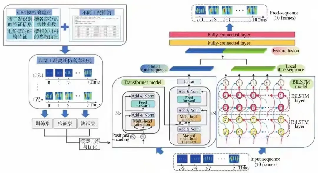 在国家提出“双碳”要求的大背景下,铝行业作为深度节能降碳的关键领域首当其冲,电解铝过程作为高耗能、大排放产业,能源消耗和排放占据整个铝行业的 90%以上,更是实现“双碳”目标的重要环节。数据显示,2024年我国电解铝产量为4400.5万t,同比增长 4.6%,总计直流电流消耗 4 950.6 亿 kWh,行业发展十分迅猛,然而,生产过程中的能源成本和生产效益之间矛盾突出,每生产出 1 t 铝,就要向大气中排放11.2 t 左右二氧化碳,阳极净耗超 400 kg,能源消耗巨大、污染巨大,对电解铝过程进行改造,实现产业升级,减小污染,节能能源刻不容缓。近年来,随着计算机、仿真技术的发展以及智能制造、数字孪生概念的普及,将铝电解与智能制造深度融合,建立数字孪生工厂,探寻一条改变传统铝电解生产的技术路线,深挖铝电解各个流程中的节能降碳能力,大幅度降低铝电解碳排放和铝生产直流电耗,推动铝电解行业向高质量发展迈进,是目前铝电解行业的发展前景,也是亟需解决的关键科学难题。铝电解过程计算机控制是现代铝电解数智化及智能制造体系构建的基础,铝电解过程计算机控制系统经历了单机群控、集中式控制、集散式控制、先进集散式控制几个阶段,铝电解过程计算机控制系统发展至今,已成为现代铝电解生产过程中必不可少的自动化装备,它的发展水平是当代铝冶炼发展水平的重要衡量标准之一。基于铝电解过程计算机控制系统,铝电解智能制造关键技术也逐步完善,对于铝电解的高效节能与大幅度减排,已有许多学者深入开展了对铝电解设备、工艺与控制技术的综合仿真优化研究,以及铝电解槽多物理场的计算机仿真优化研究。但铝电解槽高温、强磁、强腐蚀性等恶劣环境,造成检测过程采样困难,对传感器品质要求极高,且铝电解过程机理复杂、多变量之间相互耦合、海量数据难以充分挖掘,部分机理不明晰,使得铝电解过程至今仍为一个巨大的灰箱过程,难以通过建立精确的数学模型来拟合铝电解内部的反应过程。数字孪生技术是一种将现实世界中的物理实体、系统或过程在数字空间中进行高精度建模和实时映射的技术,通过使用基于多传感器采集的数据、人工智能分析方法等手段,构建出与现实对象在结构、行为和状态等方面一致的虚拟模型。与传统的仿真模型不同,传统的离线仿真模型与实际生产过程割裂,互动优化困难,虽然基于电 - 磁 - 流等物理场计算的有限元模型对于我国大型铝电解槽设计的进步发挥了重要的作用,但是有限元计算对硬件要求高,仿真耗费时间长,仿真过程与实际生产运行状态割裂,无法实时表征电解槽的行为,导致仿真结果无法在线或直接用于指导生产实践。而数字孪生强调“实时性”和“互联性”,核心特征在于模型与物理对象之间的持续互动与反馈,数字孪生不是简单静态的数字复制,而是在工业实际使用过程中不断学习、演化的动态更新智能系统。数字孪生技术的概念最初由 Grieves 于美国密歇根大学提出,随着物联网、大数据技术、AI 等关键技术快速发展,在“中国制造2025”的大背景下,数字孪生系统的构建和应用在智慧交通、智慧医疗等多个领域得到了前所未有的推进。铝电解过程可视化程度低、环境恶劣,铝电解过程参数难以实时监测,状态判定难,设备庞大、数量众多,以往采用人工经验调整铝电解槽参数并调节铝电解工况,铝电解行业整体智能化水平低。同时,难以直观了解工厂全局生产状况并及时进行分析和生产决策,严重阻碍了行业信息化的发展及铝行业的深度节能降碳目标实现。因此,亟需使用例如智能制造技术、数字孪生技术等新兴技术手段,加强铝电解过程智能化研究,推动铝电解行业智能化进程,加速实现国家“双碳”目标。B1 铝电解生产智能制造体系发展现状近年来,随着铝电解槽容量的增长,以及槽控机的逐步更新换代,铝电解槽每天涌现出海量生产数据,基于这些生产数据调控铝电解生产,是实现铝电解智能制造的关键,当前国内外学者已对氧化铝浓度分布与预测、阳极电流分布式感知、过热度预测、分子比控制等方面进行了大量的研究,并基于此实现铝电解的高效生产。1.1 铝电解过程参数优化及控制1.1.1 氧化铝浓度分布与预测氧化铝浓度是铝电解生产的关键参数,直接影响工艺稳定性,其最佳控制范围一般为 1.5%~3.5%(质量分数),主要采用模糊专家控制、自适应模糊控制、槽电阻斜率控制法等方法。随着深度学习和数字孪生技术的发展,铝电解与深度学习的结合应用不断涌现,图 1 是基于 Transformer 和 BiLSTM的氧化铝浓度预测。