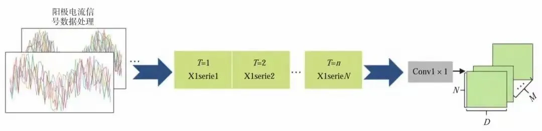 图1 基于深度学习的氧化铝浓度预测为推动铝电解数字孪生体构建,杜善周等针对传统铝电解槽多相多场离线仿真响应慢的问题,有效结合离线仿真数据与多传感器的检测数据,对氧化铝浓度进行了动态仿真研究。朱家华等采用了粒子群算法结合 LSTM 模型的方法对氧化铝浓度分布进行预测,与现有方法相比,进一步加快了模型预测氧化铝浓度的时间,并提高了预测精度。朱家华提出了一个面向工业的氧化铝浓度预测系统,实现了氧化铝生产历史数据的处理、氧化铝浓度的预测、历史曲线的学习分析等功能。区域氧化铝浓度变化的控制是实现铝电解槽分区控制的关键,陈志洋为了进一步提高大型预焙铝电解槽中氧化铝浓度的均匀性,分别对不同过热度和电解质成分下的区域氧化铝浓度进行了研究,并深入探究了阳极更换后氧化铝浓度的变化。精准控制氧化铝浓度均匀分布是铝电解正常生产的前提,氧化铝浓度过低时会导致阳极效应的发生,过高时会在槽底发生沉淀,使得能源消耗变大。故通过对氧化铝浓度进行预测,调整生产过程的氧化铝下料策略,并根据实时氧化铝浓度对槽内的“黑箱”进行工况识别和判断,是实现铝电解数字孪生体的重要技术路线。1.1.2 分布式阳极电流阳极电流与铝电解槽槽况密切相关,具有分布式特征,反映了铝电解槽的多维信息。当发生出铝、换极、抬母线、阳极效应等工况时,阳极电流会随之波动,局部阳极的动态行为进一步加剧了槽况的分布式特性。图 2 是分布式阳极电流预处理示意图。