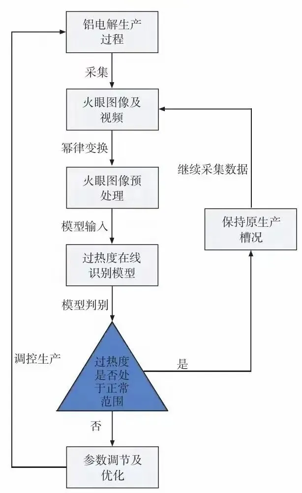 图2 分布式阳极电流数据预处理通过研究分析阳极电流时序数据,可判断当前铝电解槽所处的工况状态,从而根据工况状态针对性地调整铝电解过程参数,但阳极电流数据具有高维、时空特征复杂、数据量巨大等特点,难以从海量的数据中挖掘出隐藏的工况特征,故如果使用特定的模型算法,针对性捕获阳极电流数据中的潜在特征,能够有效地推进实现铝电解智能制造。1.1.3 过热度状态识别过热度是指电解槽中熔融氟化铝和氧化铝电解质的温度高于正常工作温度的部分,在某 400 kA 铝电解槽生产中,过热度一般控制在 8~12 ℃,适当的过热度有助于提高电解质温度,增大氧化铝的溶解,控制阳极效应,且有利于降低能耗并提高电流效率,过高的过热度可能会导致能耗增加,引起不必要的热损失,过低的过热度则可能引起冷行程和冷槽。在铝电解生产过程中,往往通过人工观察火眼来判断当前电解槽所处状态,图 3 是通过火眼图像来识别过热度识别的基本流程。但人工经验误差大,每个工人判断不一致,难以标准、科学地识别过热度,而使用基于图像识别的方法来观察火眼则更为准确。