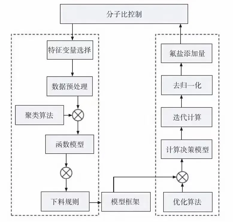 图3 基于火眼图像的过热度识别流程由于铝电解槽生产过程环境恶劣,对能够拍摄火眼图像的设备要求较高,即火眼图像的获取较为困难,为了解决这个问题,王冬雷提出了一种基于知识引导对抗生成的火眼图像生成方法,并基于截断深度字典学习对图像进行特征提取,识别当前图像所对应的槽温。铝电解槽过热度决定了铝电解槽的基本状态,其基本状态决定了铝的产量与质量,过热度的异常会致使电解槽出现极端槽况,严重时导致漏槽甚至故障停槽,故使用针对性的方法,对火眼进行特征识别和提取,是估计铝电解槽当前槽温的重要方法,也是提高电解铝生产过程安全性和可靠性的关键环节。实现铝电解槽槽温的实时监测,有利于建设铝电解数字孪生体。1.1.4 分子比控制铝电解过程中的分子比主要是指电解质中不同成分的相对比例,尤其是氟化钠和氟化铝的比例,分子比反映了当前铝电解槽的物料平衡、电流效率、铝液质量。随着低分子比工艺技术在电解铝工业中的采用,氟化铝(即氟盐)添加量的计算机控制越来越受到重视,现代铝电解槽的上部结构中安装有独立的氟化铝料斗,由计算机控制添加量,图 4 是分子比控制的基本流程。