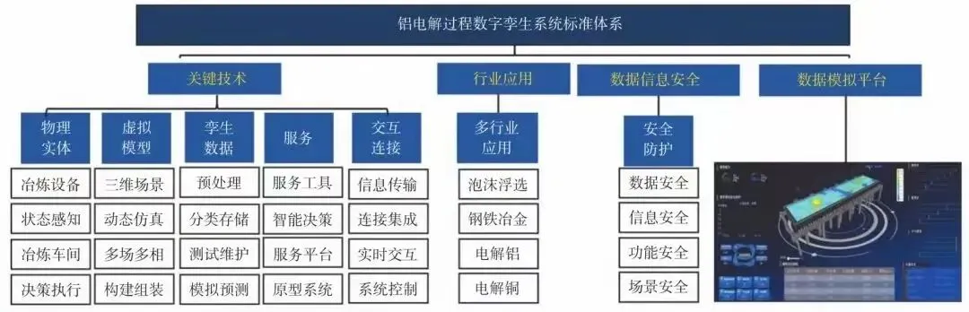 图5 铝电解数字孪生系统标准体系如图 6 所示,铝电解数字孪生原型系统分为了三个层级,首先是图 6(a)所示的铝电解厂级,在铝电解厂级中,可以查看各个车间的功能,以及生产线的投入情况概览,并可以实时查看到各功能车间内的生产消耗情况;其次是图 6(b)所示的电解槽车间级,在车间一级,可实时监测氧化铝下料及消耗、电力能源消耗、阳极使用等生产状态,在车间级选择某一台电解槽进行生产操作调整时,同一编号的物理实体电解槽也会同步进行相应生产操作;最后是图 6(c)所示的电解槽设备级,在该层级,可以实时查看电解槽生产历史数据,并展示电解槽的槽号、分子比、氧化铝浓度、两水平、阳极电流分布等实时状态信息,同时也有氧化铝下料情况、氟盐添加情况以及出铝量等生产信息;图 6(d)是设备级中电解槽的槽温动态仿真示意图,通过将动态仿真结果实时展示,可以清晰明确当前电解槽的运行状态,时刻根据不同工况进行如下料调整等决策操作。