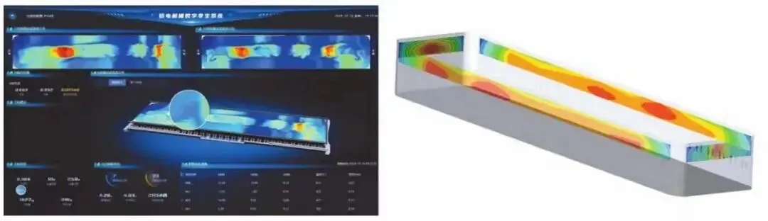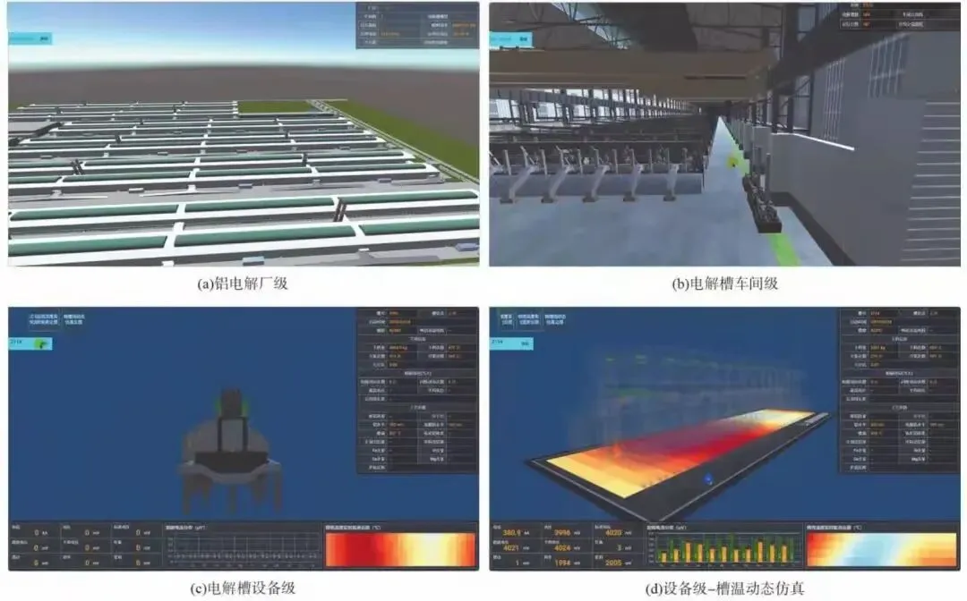 图6 铝电解数字孪生原型系统2.3.2 铝电解数字孪生体前景目标数字孪生技术在有色冶炼行业中的应用,有助于槽况稳定,以及提高生产效率和质量、减少能耗和环境污染,具有广阔的应用前景。铝电解数字孪生体的目标是实现跨领域的数据融合与智能决策,推动整个生产环节的智能自动化,通过结合人工智能、大数据和机器学习等技术,数字孪生体将具备自适应调整和自主决策的能力,进一步提升铝电解过程的稳定性、生产率和资源利用效率。但铝电解生产过程变化十分复杂,实际生产过程对数字孪生技术的需求大大超过了本文中所提到的内容范畴,要实现更加符合工业实际的完整数字孪生系统,应从以下几个方面入手进行研究:1)多学科融合。铝电解数字孪生是一个多学科交叉的领域,软硬件方面,亟待拓展数据来源渠道以确保分析结果更加客观合理,无论是软测量技术还是传感器研究,都将是虚拟现实映射的重要一环。学科知识方面,需要在材料学、化学、物理学、计算机科学、控制工程等领域有对应研究及人才培养。2)铝电解机理深入研究。针对阳极电流、氧化铝浓度等重要参数,需更深入研究机理,建立更精确的数学模型,使用更大的算力。后续研究者可继续开展其他物理场的动态仿真,并可为系统添加预警状态及专家知识等决策建议。3)物联网技术应用。铝电解数字孪生体需要使用物联网技术进行连接和交互,通过远程监测和控制,可以实现铝电解生产的智能化和自动化,降低生产成本,并提高生产效率和质量,推动铝电解智能制造向更高水平发展,实现真正意义上基于数字孪生的铝电解生产全流程智能化协同体系。B3 铝电解智能制造与数字孪生的融合应用铝电解数字孪生推动铝电解智能制造发展,智能制造要求促进数字孪生技术革新,智能制造与数字孪生技术的深度融合正在催生“认知制造”新范式,即制造系统不仅能感知物理世界,更具备有自主认识以及自我进化的能力,为进一步实现“中国制造 2025”提供关键技术支持。智能制造与数字孪生技术的融合路径如下:1)搭建铝电解全流程多物理场分布式感知网络。基于电解槽分布式在线检测与槽二维 / 三维状态信息实时感知技术,研制铝电解全流程分布式多物理场分布式感知网络,开发大型铝电解槽分布式在线检测与槽状态信息实时感知传感器与系统,实现大型铝电解槽分布式槽状态信息实时感知,将各种信息相结合,构建铝电解智能优化制造体系的最底层数据基础。2)建立铝电解生产数据全流程、全要素多元知识库。通过工业物联网、多传感器实时采集设备温度、电流、电阻等多源异构的传感数据,基于大数据与铝电解机理的智能推理算法,以电解槽全流程数据为基础,从历史操控记录和历史数据中挖掘出有效信息,并形成优化、稳定的操控策略,提升生产的稳定性和效率,实现生产操控的智能化。3)实现铝电解槽预测性维护与全生命周期管理。通过融合槽控机历史维护数据、实时运行日志,构建铝电解槽槽寿命预测模型,实现铝电解槽槽寿命诊断和剩余寿命预测,采用时序神经网络预测关键部件剩余寿命(RUL),当铝电解槽槽剩余寿命低于阈值时,系统自动生成维护工单并优化备件库存,减少非计划停机造成的生产损失。4)形成铝电解动态仿真技术。通过集成 CFD 仿真、材料特性数据库与动态仿真技术,将铝电解槽工业检测数据及电解槽电化学机理模型相融合,同时应用机器学习与 AI 加速理论与方法,优化铝电解槽相场强耦合模型迭代及模型降阶,实现对全槽动态相场行为的实时高精度量化,形成基于模型降阶与加速铝电解多相多场动态仿真模型,实现对以槽膛内形与氧化铝浓度为典型代表的动态仿真模型。智能制造与数字孪生技术的深度融合正在重塑现代制造业的底层逻辑,通过构建完整的铝电解槽“电 - 磁 - 热 - 流 - 力 - 浓度场”耦合仿真模型,以及对相关材料的取样与测试完成模型设定,并离线计算得到各工况下的“电 - 磁 - 热 - 流 - 力 - 浓度场”的离线仿真结果,构建铝电解动态仿真模型,包括如图 7 所示的氧化铝浓度动态仿真和槽帮动态仿真模型。这种虚实共生体系不仅能在虚拟空间预演工艺参数优化、故障根因追溯等复杂场景,更能通过机器学习驱动的动态仿真预测设备劣化趋势,使制造系统具备自感知、自决策、自优化等自适应能力,推动制造业向“预防性维护”及“零缺陷生产”的更高维度跃迁。图7 氧化铝浓度动态仿真(左)和槽帮动态仿真(右)