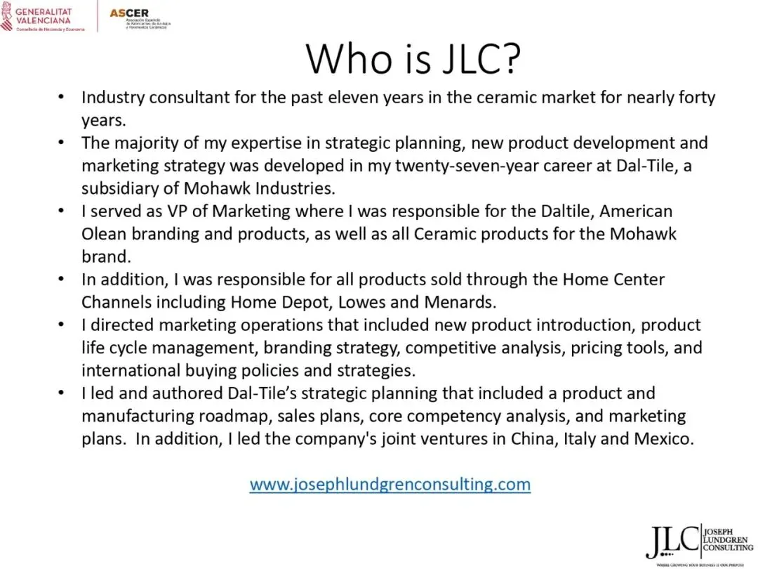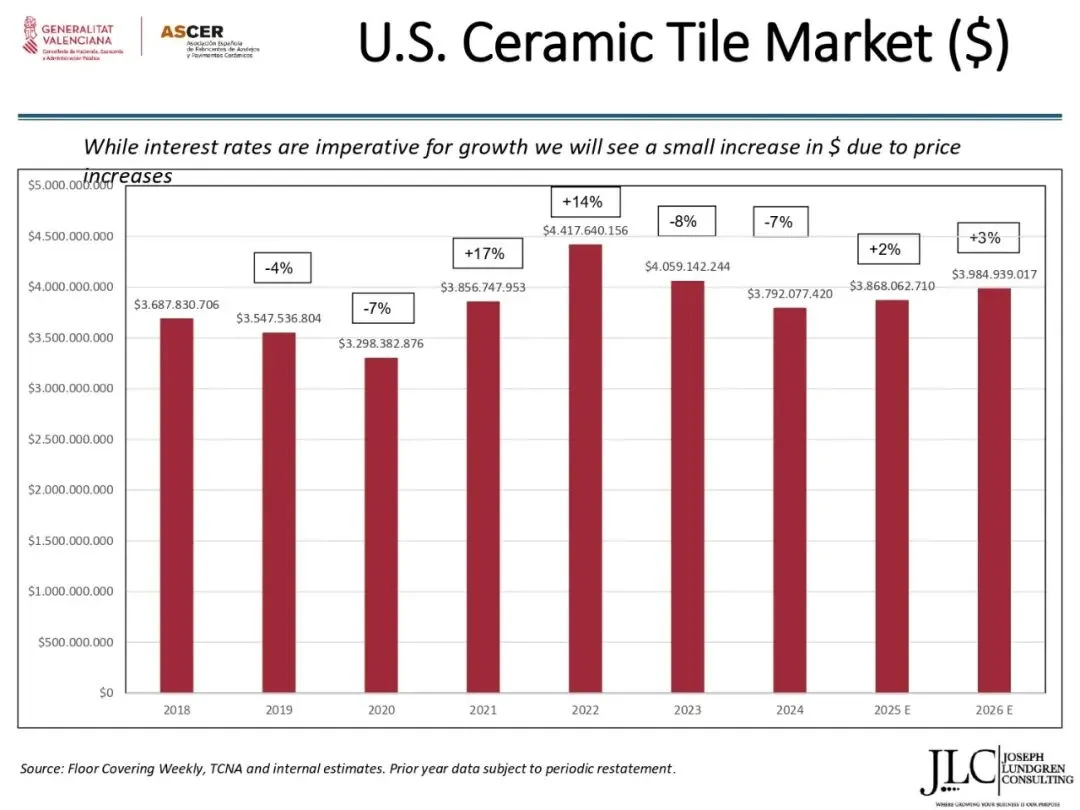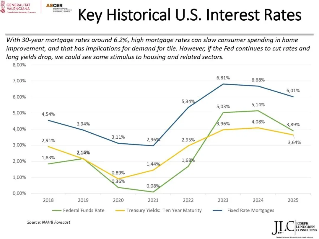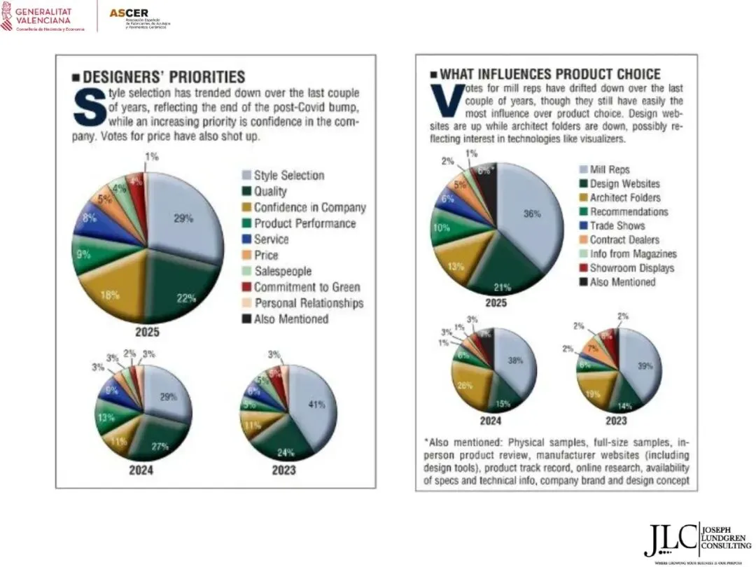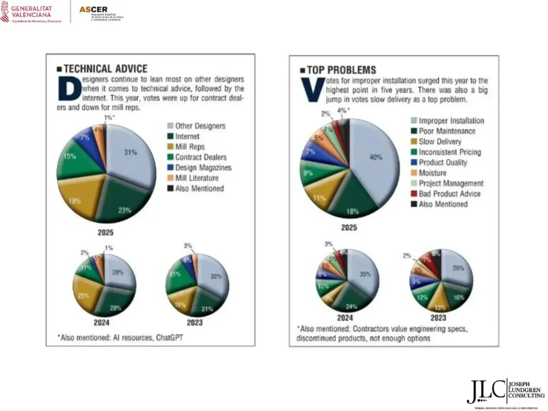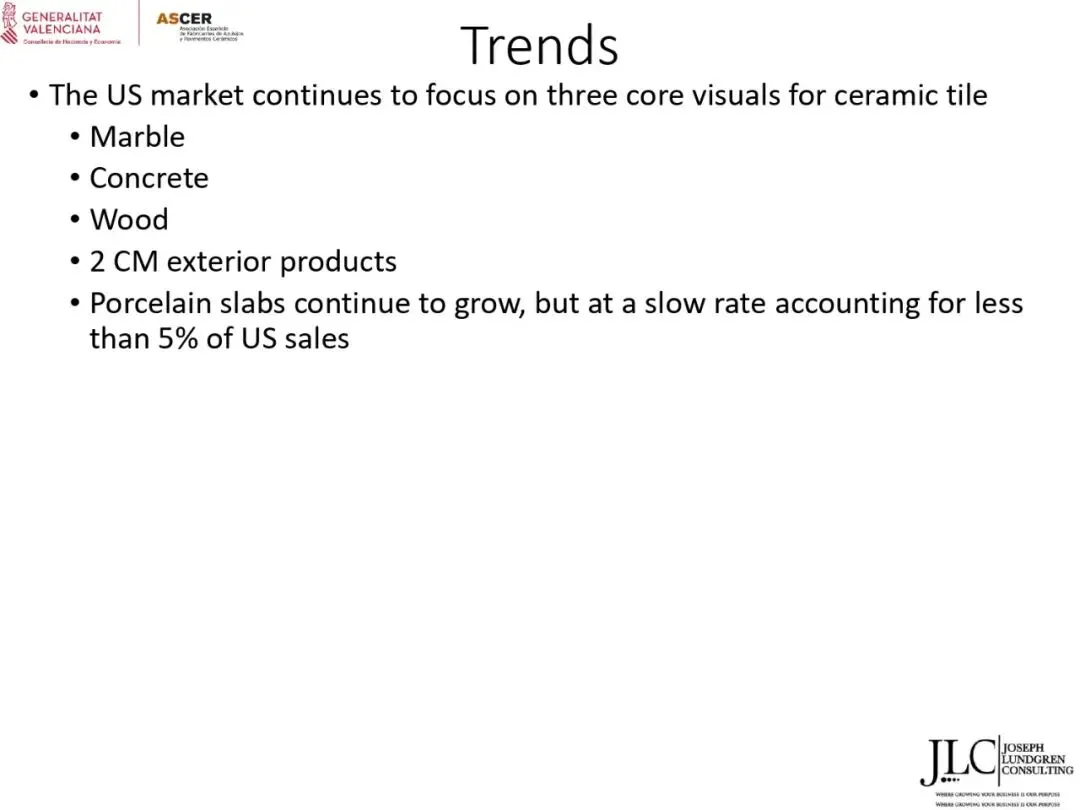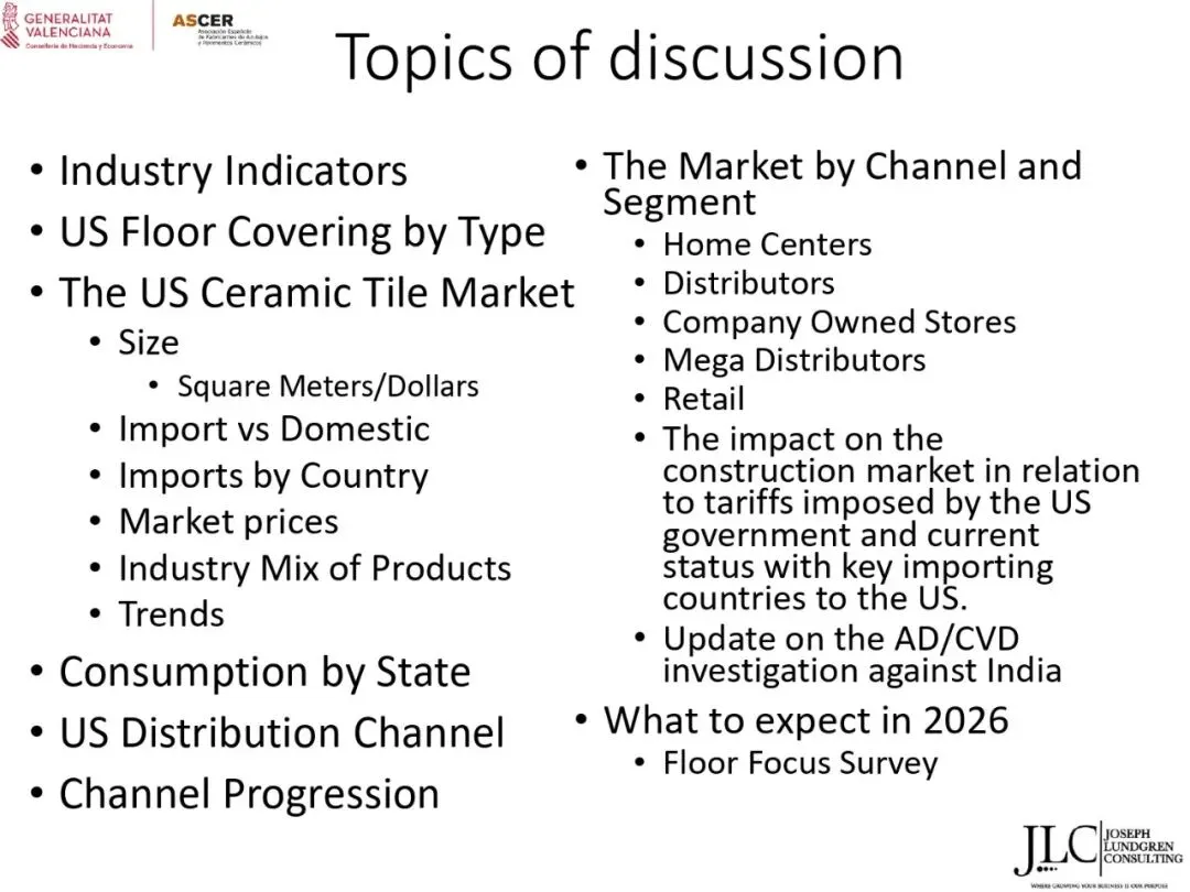 ASCER近期举办了一场网络研讨会,介绍了JLC咨询公司根据与瓦伦西亚自治区政府经济、财政和公共管理部合作协议开展的美国市场调研结果。约30名与会者参加了此次研讨会。会上,咨询顾问乔·伦德格伦对报告进行了详细分析,内容涵盖了从美国宏观经济指标到建筑业发展、瓷砖和地板市场现状,以及主要分销渠道、竞争材料和新兴趋势等各个方面。