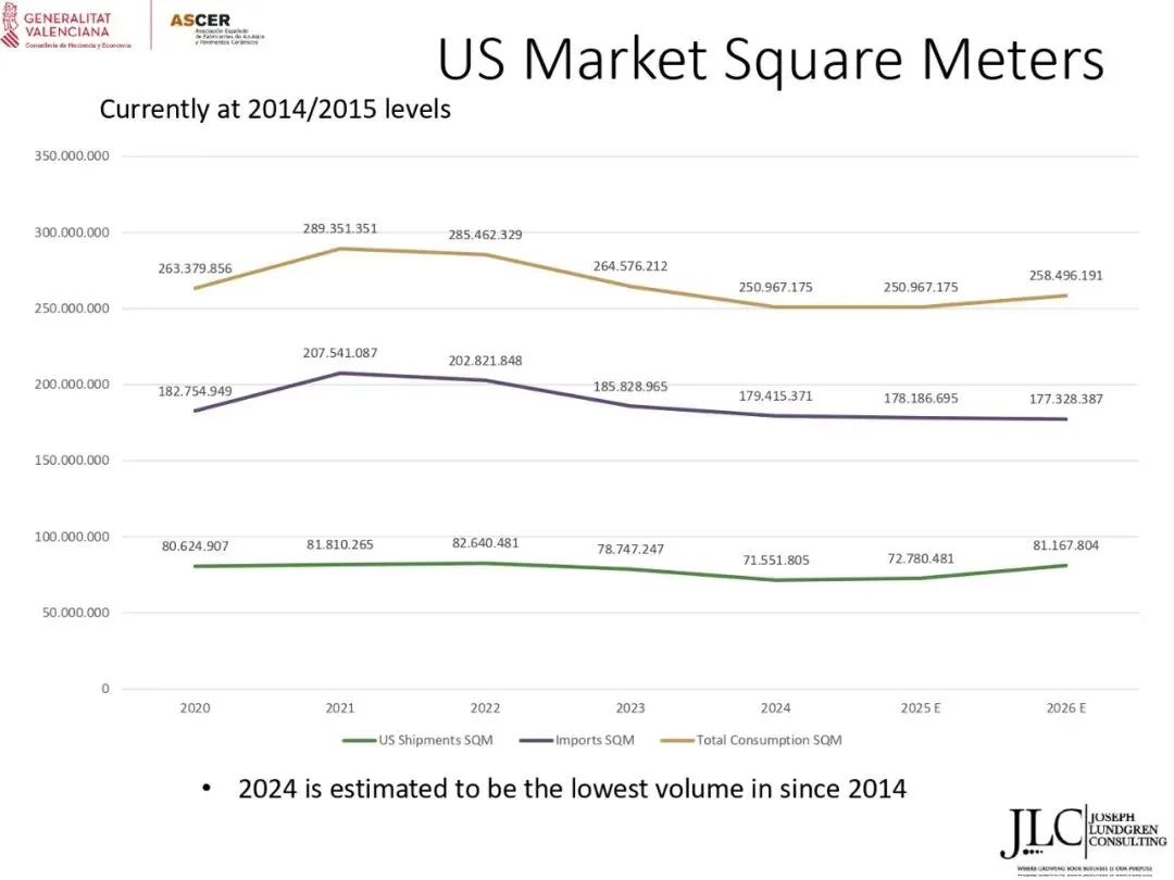 2024年,美国是西班牙瓷砖最大的出口市场,销售额达到4.702亿欧元(增长3.1%)。2025年前九个月,销售额累计增长3.1%(达到3.6亿欧元)。