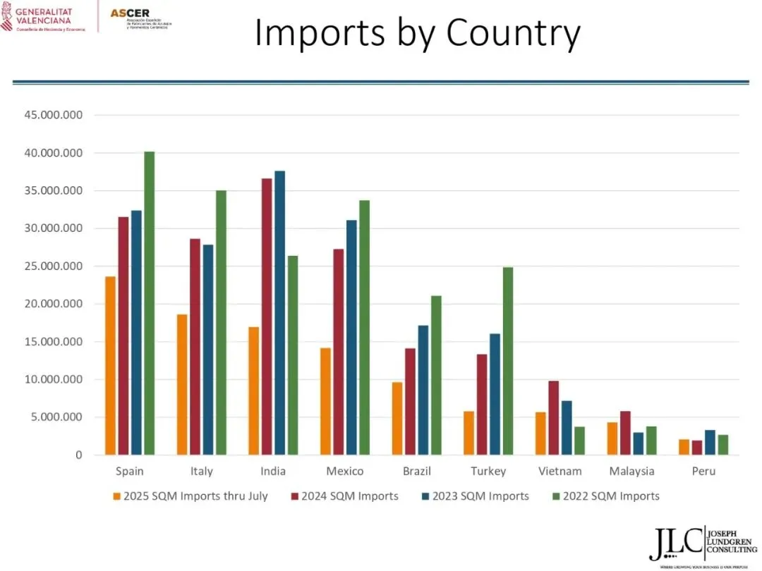 根据这项研究,2024年美国瓷砖市场销量约为3200万平方米,其中西班牙占据17.6%的市场份额,仅次于印度,位居第二。然而,从2025年到7月的数据来看,西班牙已成为该市场销量最大的供应国。