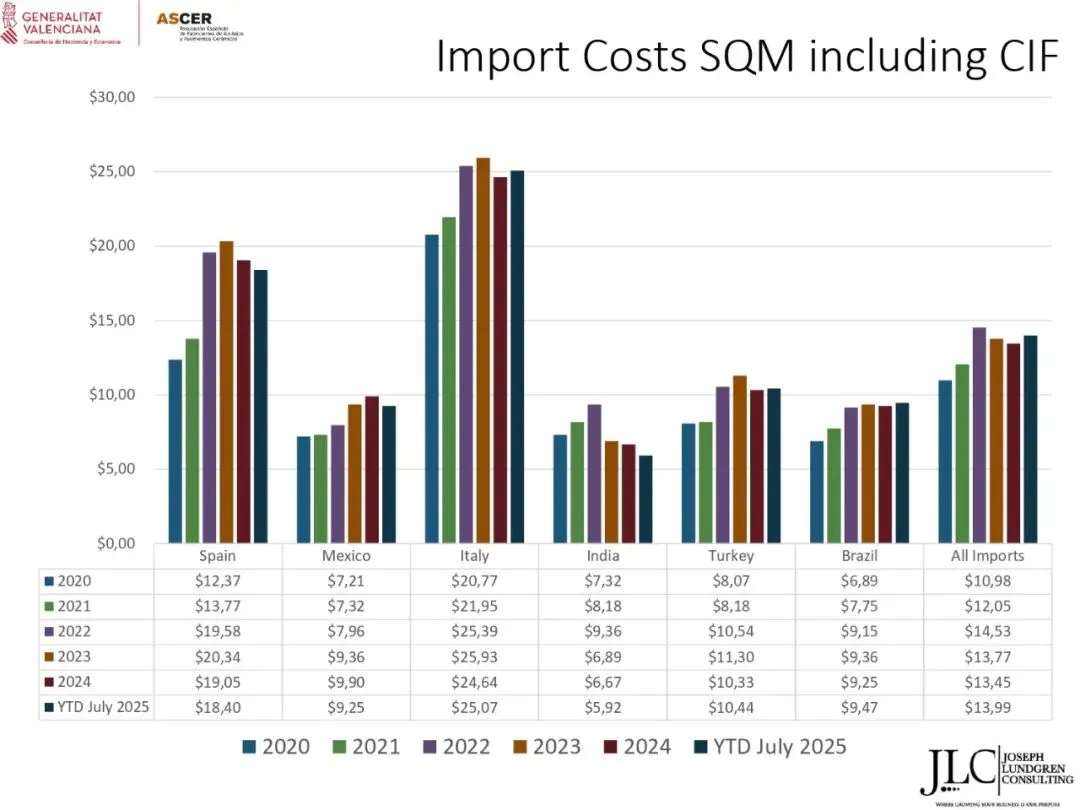 根据这项研究,2024年美国瓷砖市场销量约为3200万平方米,其中西班牙占据17.6%的市场份额,仅次于印度,位居第二。然而,从2025年到7月的数据来看,西班牙已成为该市场销量最大的供应国。