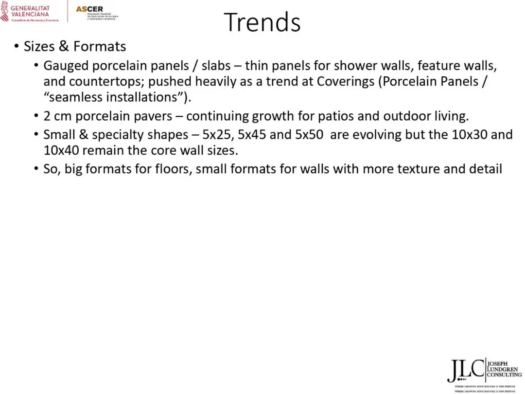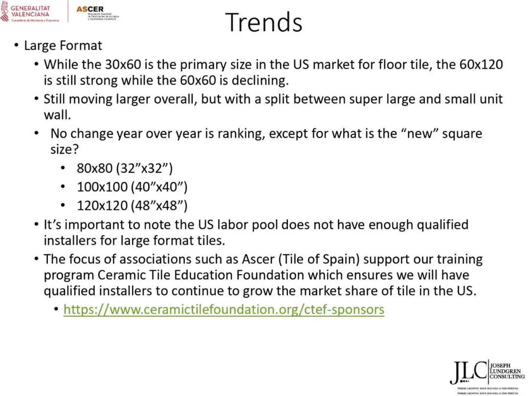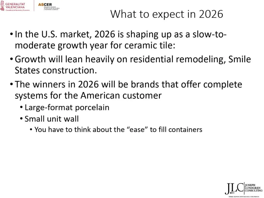 ASCER近期举办了一场网络研讨会,介绍了JLC咨询公司根据与瓦伦西亚自治区政府经济、财政和公共管理部合作协议开展的美国市场调研结果。约30名与会者参加了此次研讨会。会上,咨询顾问乔·伦德格伦对报告进行了详细分析,内容涵盖了从美国宏观经济指标到建筑业发展、瓷砖和地板市场现状,以及主要分销渠道、竞争材料和新兴趋势等各个方面。