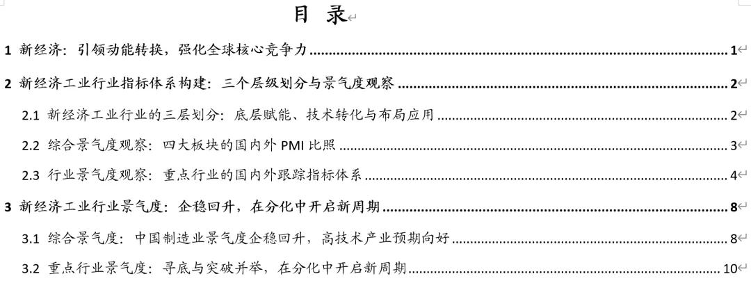 新经济工业行业指标体系构建:三个层级划分与景气度观察:本文构建的反映新经济、新动能行业发展状况的指标体系,尽可能全面覆盖了新经济的主要维度,如科技创新、数字经济、产业转型升级等。同时,在具体指标选取上注重代表性,优先选用高频数据,并细化为三级分类。三层分类体系以新一代信息技术和新材料作为底层赋能基础;以高端装备和新能源为核心支柱,体现制造与能源竞争力;以新能源汽车、生物技术、绿色环保、航空航天与海洋装备为融合应用与战略前沿领域,展现技术集成与国家战略布局。在三层分类基础上,选取高技术产业、制造业、服务业与消费四大板块的国内外PMI比照进行综合景气度观察,同时通过搭建重点行业的国内外跟踪指标体系,跟踪行业景气度。