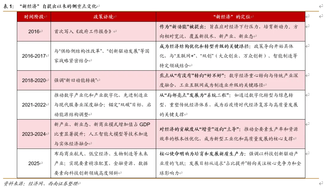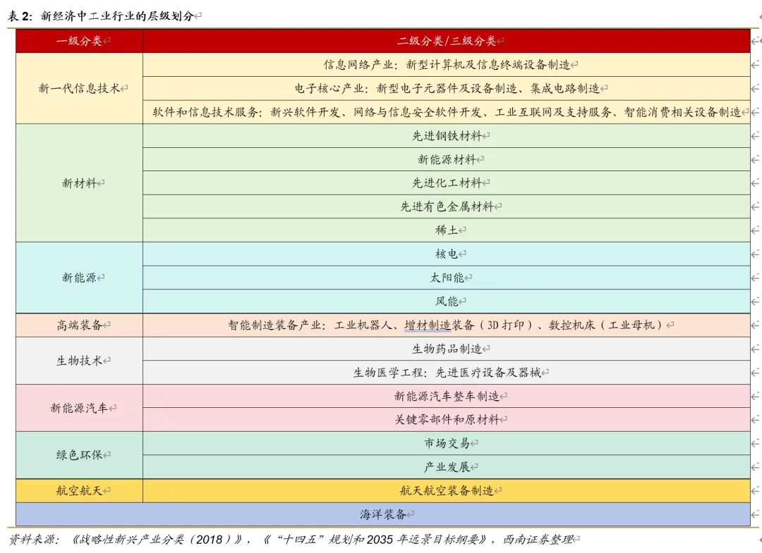 为了科学界定新经济的范围,我们将国家统计局发布的《战略性新兴产业分类(2018)》中九大类别作为新经济工业产业范畴的核心基础,具体包括:新一代信息技术产业、高端装备制造产业、新材料产业、生物产业、新能源汽车产业、新能源产业、节能环保产业、数字创意产业及相关服务业。此后,2021年发布的《“十四五”规划和2035年远景目标纲要》在延续此框架的同时,聚焦新一代信息技术、高端装备制造、新材料、生物、新能源汽车、新能源、节能环保等七大产业,并将航空航天与海洋装备提升至新兴产业的战略高度,体现了国家产业布局的动态调整与重点倾斜。2025年“十五五”规划建议进一步强调新能源、新材料、航空航天等领域的核心动能地位,标志着这些产业将成为国家中长期发展的重要支撑。
