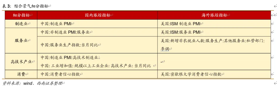 为构建综合景气观测体系,本研究从宏观经济的关键部门出发,选取高技术产业、制造业、服务业与消费四大板块,并分别为其筛选具有代表性的高频指标,以刻画经济景气特征。制造业方面,以国内外权威的采购经理指数(PMI)为核心。国内直接采用制造业PMI作为综合景气标杆,海外则对标美国ISM制造业PMI,用全球制造业景气度为国内景气判断提供外部参照。服务业方面,国内通过服务业PMI和服务业生产指数衡量行业活跃度与产出,海外跟踪美国ISM服务业PMI及服务业非农就业人数,以揭示劳动力市场对服务需求的支撑作用。消费方面,国内外均采用消费者信心指数,通过微观主体的情绪变化,前瞻判断终端消费需求的潜在走势。