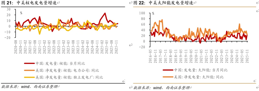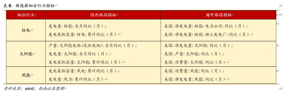 3、新能源细分行业:国内发电量和产量,以及装机容量的同比变化,同步监测了行业的短期产出波动与中长期产能扩张节奏,同时反映了政策支持与技术迭代下的实际运行效益。同时,引入美国在发电、消费及产量维度的对应指标,有助于识别全球能源转型的共性趋势与区域差异。