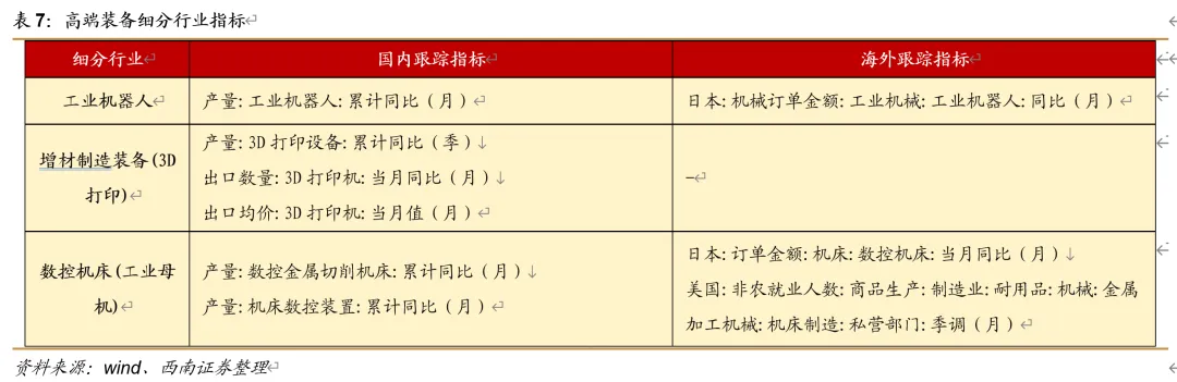 4、高端装备细分行业:国内产量与出口的数据直接监测工业机器人、增材制造装备和数控机床各领域的供给能力与外部需求变化,其中产量累计同比反映产能扩张节奏,出口数量与均价则揭示国际竞争力与产品结构升级状况。同时,引入日本在工业机器人及数控机床的订单金额同比作为海外对标,旨在借助全球领先市场的需求波动为国内景气判断提供前瞻参照,而美国机床制造业就业数据则从劳动力维度验证产业链活跃度。