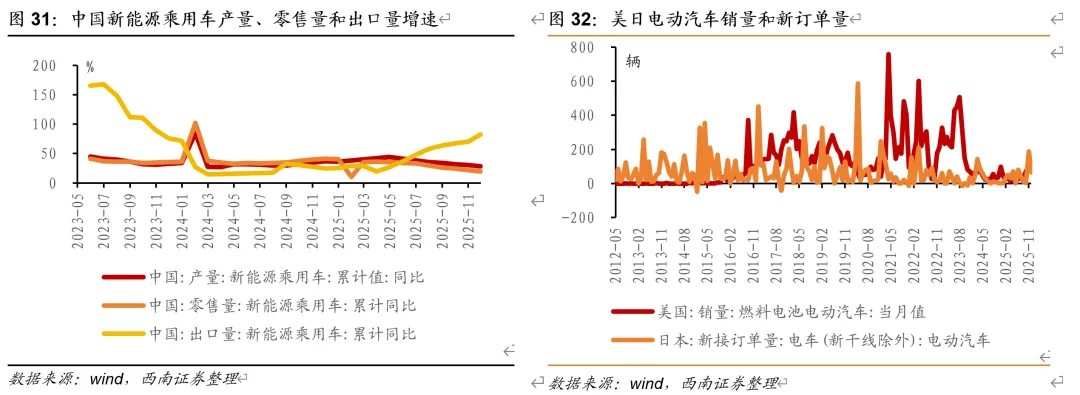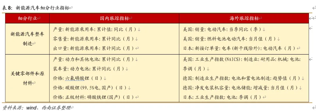 5、新能源汽车细分行业:对于整车制造,国内指标选取新能源乘用车的产量、零售量及出口量累计同比,以同步监测国内生产、终端消费及国际化进展。海外则对标美国电动汽车销量及日本电车订单数据,通过观察发达市场的需求变化为国内趋势提供验证。对于关键零部件及原材料,国内以动力电池产量、装车量追踪下游需求强度,并以碳酸锂、六氟磷酸锂等核心原材料日度价格捕捉成本与供应链波动。海外则引入美、德、日三国的电池生产指数、储能装机等数据,从全球产能与投资角度,验证产业链中游的扩张节奏与技术演进方向。