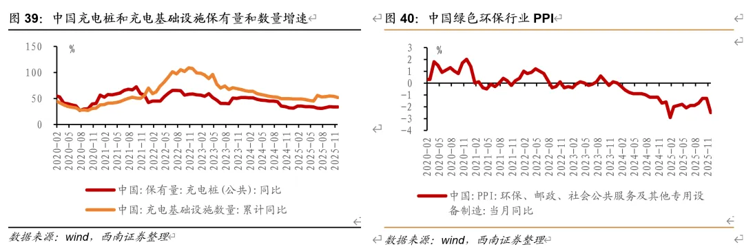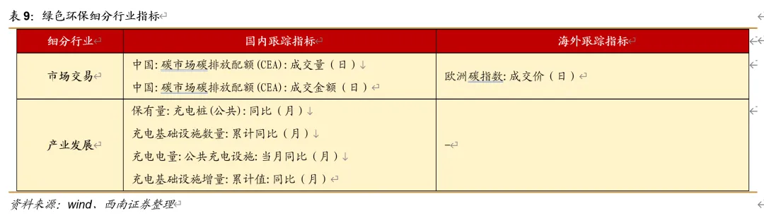 6、绿色环保细分行业:行业主要分为市场交易与产业发展两大维度,其中市场交易维度通过国内碳排放配额(CEA)的日度成交量、成交金额,直接监测全国碳市场的流动性和价格发现机制,并同步对标欧洲碳指数日度成交价,以全球最主要的碳定价基准为参照,评估国内碳价的国际联动性与相对水平。产业发展维度则聚焦于电动汽车基础设施这一关键落地领域,通过充电桩保有量、充电设施数量及充电电量等多个月度同比指标,追踪国内绿色基础设施的实际建设进度、使用效率与投资扩张节奏。