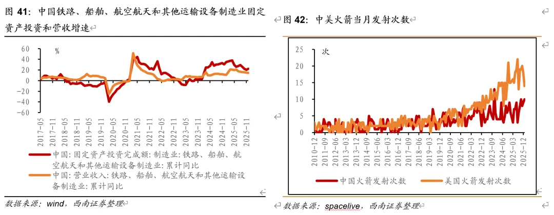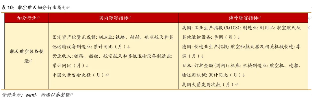 7、航空航天细分行业:国内通过固定资产投资完成额与营业收入的累计同比,监测行业长期资本投入强度与短期经营景气变化。同时以月度火箭发射次数直接量化航天活动的核心产出频率。海外则同步对标美国、德国、日本的航空航天制造生产指数,旨在捕捉全球主要制造强国的产业链波动与协同效应,并通过美国火箭发射次数进行横向比较。