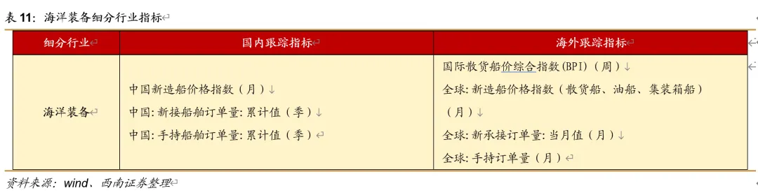 8、海洋装备细分行业:国内以中国新造船价格指数反映国内船厂定价能力与市场景气,以新接船舶订单量和手持船舶订单量分别追踪新增需求与在手任务饱和度,形成从短期价格信号到中长期产能负荷的观测链。海外指标则通过覆盖散货船、油船、集装箱船等多船型的全球价格指数、新增订单及手持订单数据,构建全球船舶市场的景气基准,其中周度的国际散货船综合指数可反映干散货航运市场的波动。