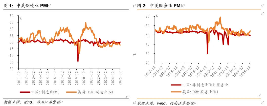 受新冠疫情冲击,中美制造业PMI分别于2020年2月和4月创下历史低位,凸显了全球供应链在极端压力下的剧烈震荡及此后快速修复的韧性。之后,两国制造业景气周期逐渐分化:中国制造业PMI在波动中修复,至2025年12月已回升至荣枯线以上(50.1%),反映出在一系列稳增长政策支撑下,制造业活动呈现复苏态势;美国ISM制造业PMI在2023年后走势反复,2025年12月仍处于47.9%的收缩区间,主要受内需不振、成本高企、政策不确定性及劳动力市场结构性疲弱等因素影响。