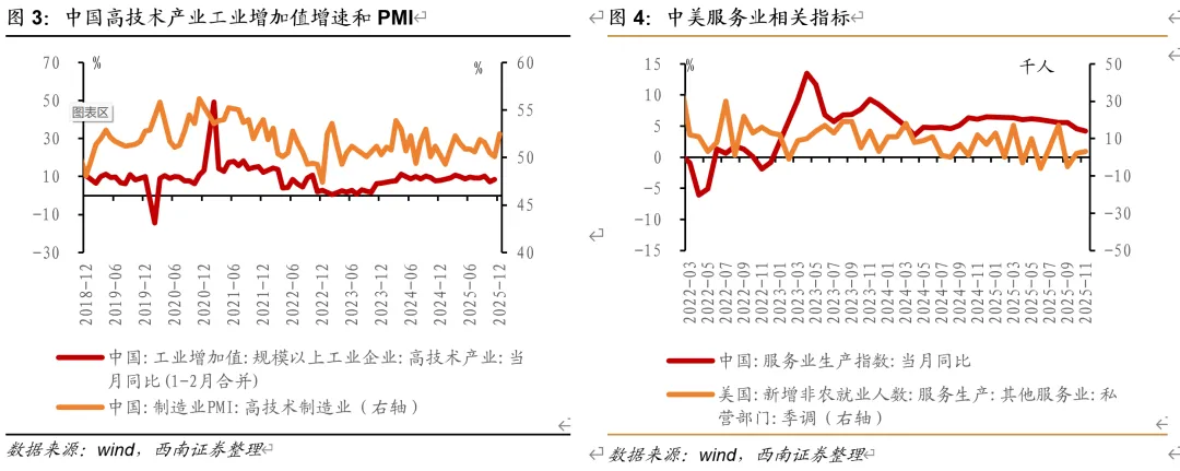 从中美服务业相关指标看,2023年前,中国服务业生产指数在正负区间宽幅震荡,显示了疫情冲击、政策调整与需求修复的复杂过程。随着防控政策优化,指数增速在2023年上半年迅速冲高。但此后动能未能持续,增速逐步回落。此后,增速在低位区间波动,增长动力从初期的脉冲式反弹转换为依赖于居民收入预期和消费信心的修复。美国服务业新增非农就业人数从2022-2023年初3万人左右的高水平回落至2025年1万人左右的温和增长区间,或与美联储激进加息的滞后效应有关。至2025年底,中美服务业均朝着新的“平衡点”收敛,中国服务业能否突破当前相对较低的增速,主要取决于稳就业、增收入政策的实效。美国服务业则取决于美联储的降息部署,以及降息对服务消费与投资意愿的促进作用。