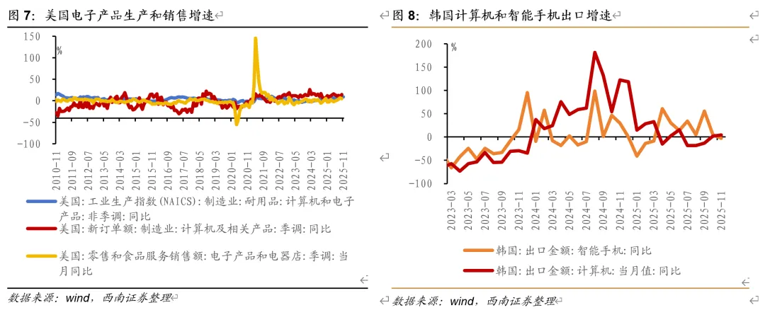从韩国计算机和智能手机出口增速来看,2023年以来,韩国智能手机和计算机出口增速均呈现波动上升,到2024年8月达到峰值后波动回落至0值附近水平。韩国在存储芯片、高端显示屏等关键部件占主导,出口增速与全球半导体周期高度联动。近年部分组装产能向东南亚、印度等地转移,可能导致韩国整机出口增速承压。随着全球半导体周期步入上行阶段,换机需求或温和回升。然而受季节备货、库存回补节奏影响,增速或继续在低位波动,趋势性大幅反弹概率较低。