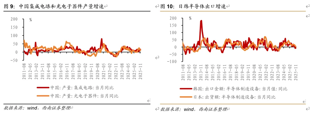 从我国集成电路和光电子器件产量增速来看,集成电路产量增速在2017-2018年、2020-2021年经历了两次“峰值-谷值”完整周期,主要由需求波动和库存周期驱动。2024年下半年至2025年,增速从底部有所反弹,表明行业正在消化过剩库存,同时在国产替代和汽车、AI芯片等新兴需求支撑下进行结构性修复。光电子器件增速自2021年以来与集成电路增速渐趋一致,且增速中枢明显下移,标志着行业从过去受益于光纤到户、4G/5G建设的高增长进入到成熟发展期。其波动与通讯基础设施建设周期、新能源汽车等国内主导的投资需求关联紧密。我国集成电路预计将呈现弱复苏状态。复苏力度取决于消费电子的换机潮强度,以及工业、汽车领域的补库需求。光电子器件依赖“光技术”在新场景的渗透,如激光加工在制造业的应用、智能座舱与自动驾驶中的光学解决方案、生物医疗光学检测等。