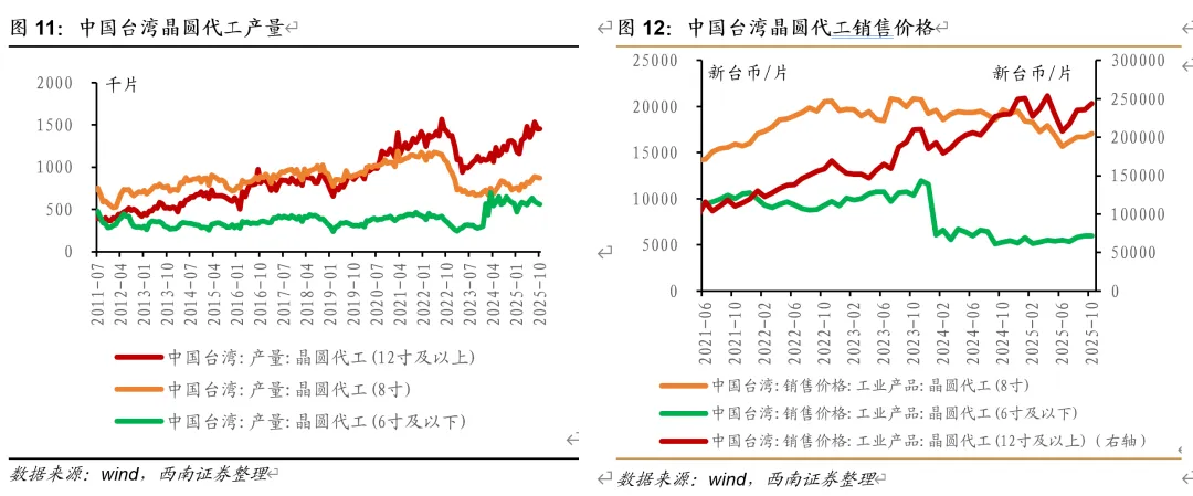 从中国台湾晶圆代工产量和价格来看,晶圆代工产量增速在2023年由于疫情冲击经历短期回调之后逐步恢复,开启了一轮持续至今的强劲上升浪。分品类来看,12寸晶圆产量在2025年后再次加速上扬。2023年底以来,12寸晶圆价格呈陡峭上升趋势,速度和幅度远超其他尺寸。此轮量价齐升的驱动力是人工智能、高性能计算对尖端制程的迫切需求。这些芯片设计复杂、流片成本高,客户愿意为产能和性能支付溢价。8寸晶圆产量自2024年起保持稳定上升,显示出汽车电子、工业控制、电源管理芯片等领域的需求持续强劲,产能利用率饱和。8寸晶圆价格自2021年起稳步上涨,但中枢在2024年后持续下移。这主要是因为占8寸产能较大比重的消费电子领域在2023-2024年持续进行库存调整,需求疲软。这导致相关芯片订单价格承压,拉低了整体平均售价。6寸及以下晶圆产量总量不大,但近期的陡峭上升表明在功率半导体、模拟芯片、MEMS传感器等特色工艺领域的需求正在快速释放。6寸及以下晶圆价格在2024年初经历明显回调后,价格趋于平稳,整体价格低于8寸和12寸产品。价格回调表明该市场可能经历了短期产能过剩或竞争加剧。或因部分通用型、低端产品面临压力。