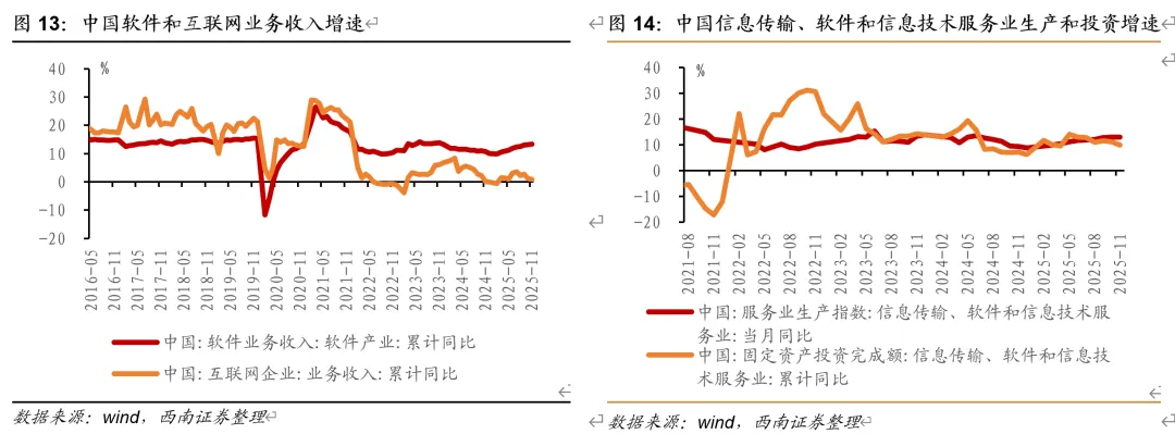 从我国信息业相关生产和投资增速来看,信息业生产指数同比增速较为稳定,自2024年初以来稳定在10%-15%区间内窄幅波动,表明行业的短期生产活跃度保持强劲,数字化需求具备韧性。固定资产投资完成额累计同比增速在2022年初冲击探底后迅速回升,目前也稳定在10%-15%区间,并与生产指数增速渐趋一致。我国信息业持续处于稳健扩张通道,行业基本盘需求稳固,是经济增长中的高景气板块。未来投资将高度集中流向人工智能算力、关键基础软件和产业互联网等领域,生产活动的稳健增长将依靠AI融合应用和软件与互联网服务的出海两大新引擎。