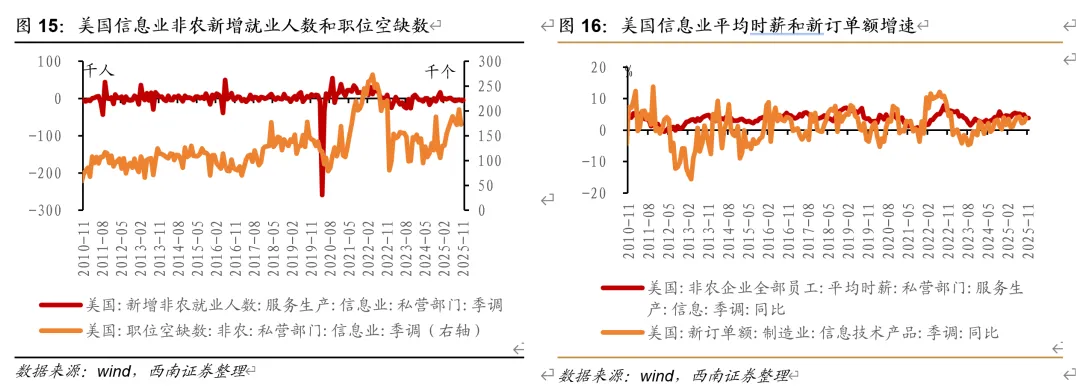 从美国信息业就业数据来看,自2020年触底后急剧反弹,长期维持在高位。这表明行业对技术人才的需求极其旺盛,业务扩张或技术迭代的内在驱动力依然存在。职位空缺数在2021年经历了历史性飙升后,持续在15万左右高位震荡。这表明行业对人才的结构性需求较为旺盛,业务创新和技术迭代创造了大量新岗位需求。新增非农就业人数自2023年以来波动性加剧,频繁在正负区间切换。这与高位稳定的职位空缺形成鲜明对比。这种背离反映了岗位依然大量存在,排除了行业陷入全面衰退的可能性。但剧烈波动和负增长的出现主要源于高利率和宏观经济不确定性下,企业控制人力成本扩张,招聘决策更趋谨慎,同时大量空缺岗位要求高技能,市场有效供给不足。