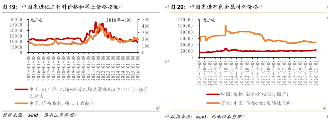 2、新材料细分行业:价格作为市场供需关系的灵敏信号,能够直接反映新材料各细分领域的市场热度与成本变动。碳结钢价格用于跟踪先进钢铁材料的需求,而多晶硅料、磷酸铁锂等新能源材料价格则关联了光伏和动力电池的产业链动态。同时,这些指标采用日度或周度高频数据,能够及时捕捉行业因技术迭代、产能调整或政策影响带来的快速波动,确保监测的实时性。此外,指标聚焦于各行业的核心品种,如EVA树脂对应先进化工材料、海绵钛对应高端有色金属应用,有助于构建既能反映市场变化、又能定位关键赛道景气度的有效观测框架。