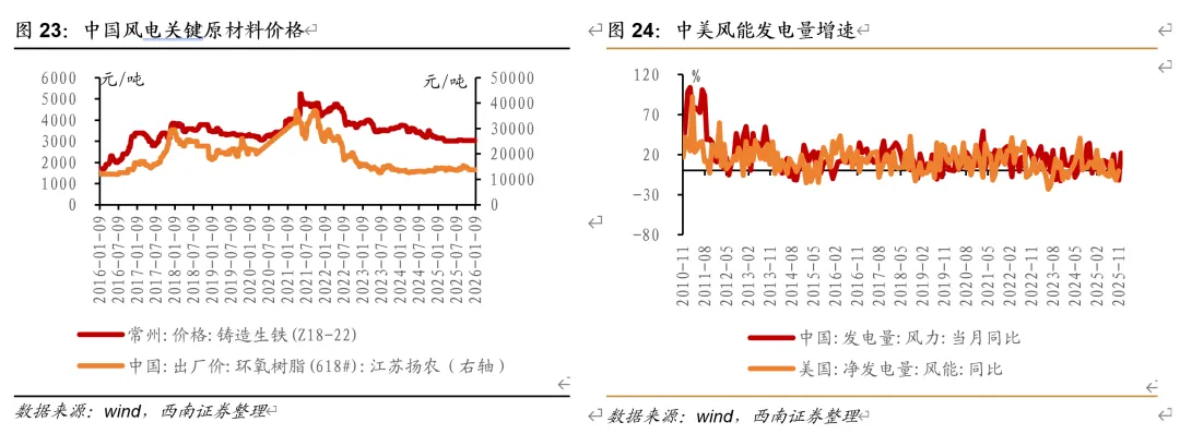 铸造生铁和环氧树脂是风电行业的关键下游原材料。两者价格均在2021年达到历史极值。这主要由全球宽松货币政策下的需求刺激、疫情导致的供应链中断以及 “双碳”目标初期的高预期共同驱动。2021-2023年,价格自峰值断崖式下跌。标志着刺激政策退潮、行业进入主动去库存和价格泡沫出清阶段。2023年至今,价格在深度回调后进入了幅度明显收窄的横向震荡区间。铸造生铁在3000元/吨上下波动,环氧树脂在13000元/吨附近波动。后续房地产、基建及通用机械设备投资的需求将引导铸造生铁的价格走势,同时价格也依赖宏观政策对制造业和基建投资的刺激效果。环氧树脂是风电叶片的核心基体材料,风电装机的招标与建设节奏将影响环氧树脂的价格走势。