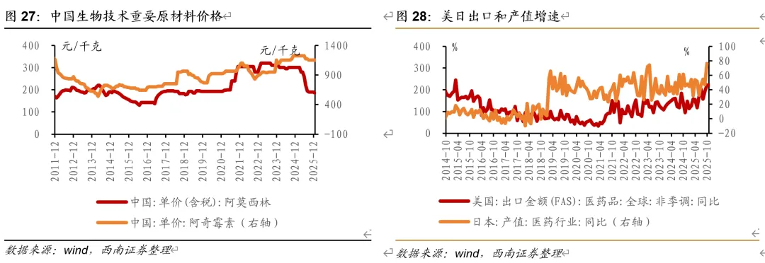 从美日出口和产值增速来看,美国医药出口金额同比在经历了2021年的短期回调后,自2023年起开启了一轮反弹,目前增速已攀升至200%左右的历史高位。这反映了全球市场对美国创新药、生物制剂以及高端原料药的需求旺盛。出口高增长不仅受益于美元汇率和基数效应,也受到全球医药供应链对美国技术和产品的依赖驱动。后续全球医保控费压力可能对高价创新药的支付形成约束,影响出口金额的增速,美国医药出口增速或在高位震荡,进一步大幅上行的空间有限。日本医药产值同比自2020年后长期运行在50%左右的高位,远超历史水平。这体现了日本创新药成果进入集中收获期,以肿瘤、免疫、神经科学等领域的新药在全球上市和放量,驱动了产值的高增长。当前增速虽有高位波动,但中枢依然坚挺,增速的持续性取决于后续研发管线的强度和上市成功率。